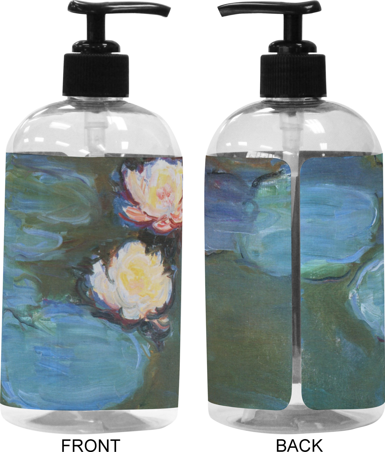 We adhere and wrap your custom printed design around the clear plastic bottle; there is a slight gap at the back for you to see the liquid level. Your design is printed on high gloss vinyl with eco-solvent inks and completely waterproof and will not fade or deteriorate over time. The vinyl is machine cut and adhered by hand to the clear plastic bottle.