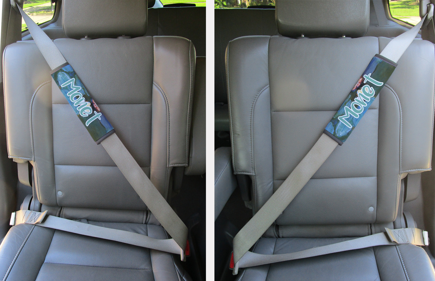 Made from neoprene, our seat belt strap covers wrap around the belt itself and have a Velcro tab for easy attachment and closure. The belt's edges are trimmed with a black polyester for a secure finish. Each cover is 9.5 by 7 inches when open and 9.5 by 2.5 inches when closed. We print your personalized design on the face of the seat belt pad.