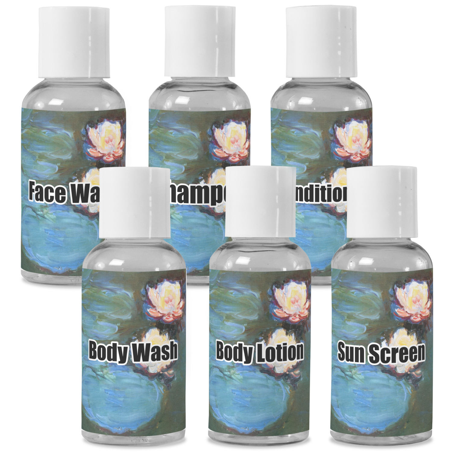 These soap and lotion travel bottles are the perfect place to start. Each set comes with 6 clear plastic bottles with white pop top lids. The bottles are cylindrical and can hold approximately 2.7oz. Perfect for plane travel!