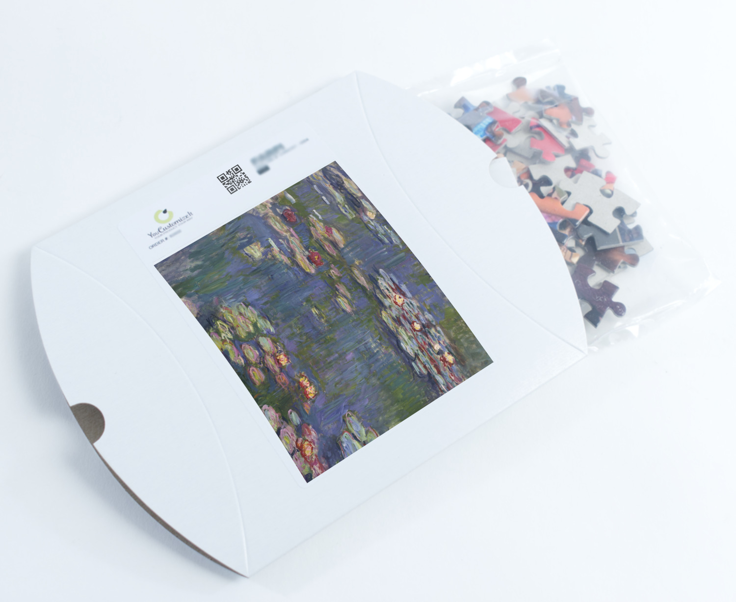We print our puzzles on thick white chipboard in vibrant colors, then laminate the chipboard and die cut your puzzle. Your jigsaw puzzle is shipped to you in a box with the image of the puzzle on the box.