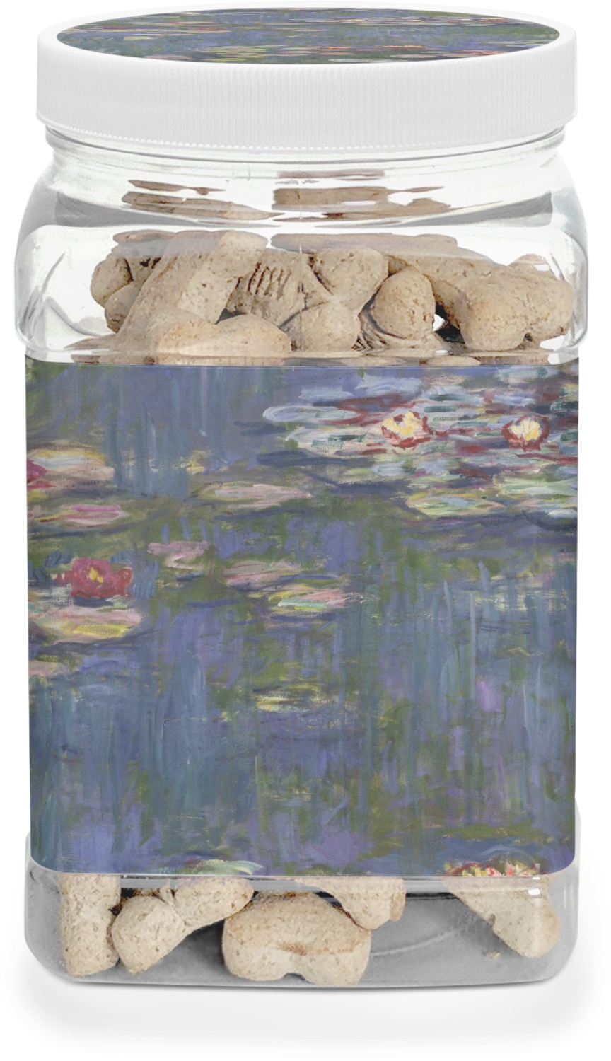 This half gallon jar, made from a sturdy plastic, is the perfect way to keep treats from any naughty pet paws, while still keeping them ready on hand for when your pup performs an impressive trick. This dog cookie jar features a screw-on, white lid that displays your personalized design on a vinyl sticker. We apply another customized sticker that wraps around the front and sides of the jar. Our dog treat jar also has indentations on the rear ends of the sides, which allows for convenient handling, and its square frame allows for easy storage.