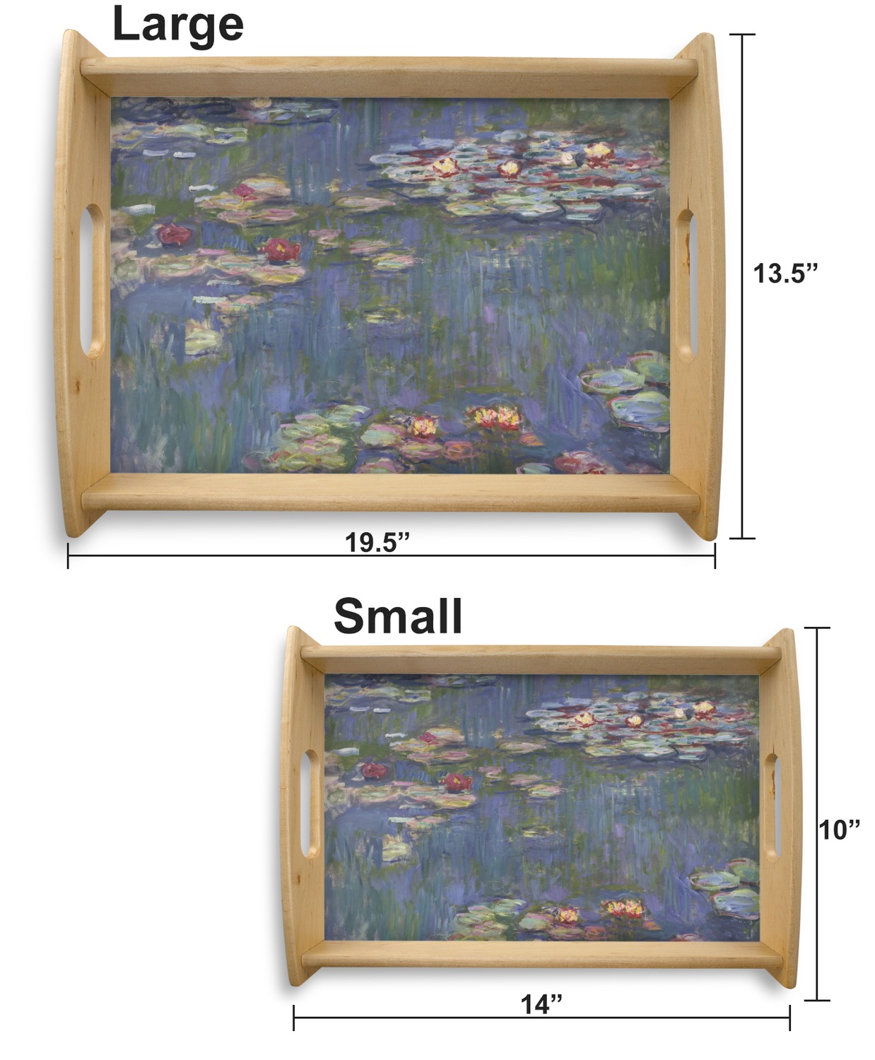 This serving tray with handles features square edges and two rounded sides, creating a very modern look. Each side is fabricated from a beautifully cut, natural wood. The bottom of the interior of the tray displays your customized design in bright, vibrant color. The tray is sold in both a black color and a natural wood look. Each variation of the wood serving tray has two sizes: Small, which is 14" x 10" x 2.25", and Large, which is 19.5" x 13.5" x 2.75".