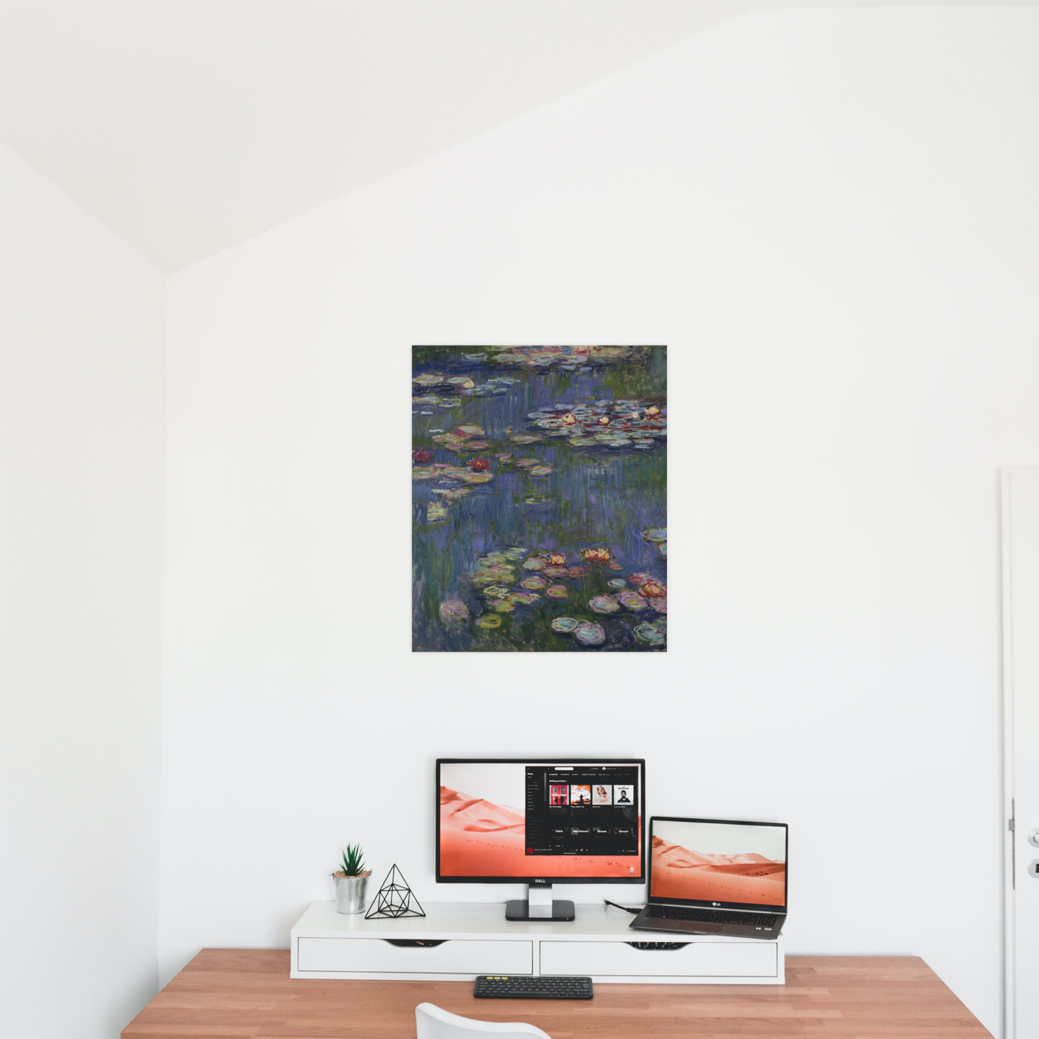 Water Lilies is a series of approximately 250 oil paintings by French Impressionist Claude Monet (1840-1926). The paintings depict Monet's flower garden at his home in Giverny, and were the main focus of Monet's artistic production during the last thirty years of his life. Many of the works were painted while Monet suffered from cataracts. (Source: Wikipedia)