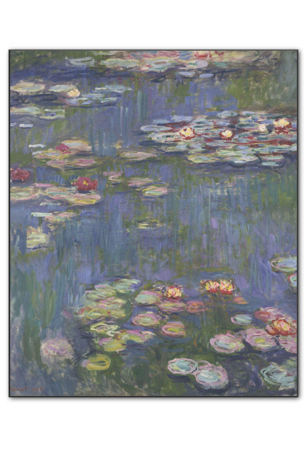 Water Lilies is a series of approximately 250 oil paintings by French Impressionist Claude Monet (1840-1926). The paintings depict Monet's flower garden at his home in Giverny, and were the main focus of Monet's artistic production during the last thirty years of his life. Many of the works were painted while Monet suffered from cataracts. (Source: Wikipedia)
