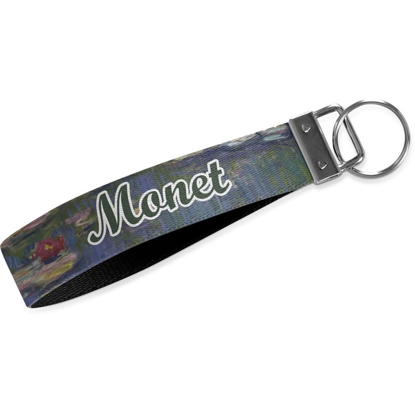 These key fob keychains are made from a polyester weave, right here in the USA. They feature a silver, metal clasp, attached to a round keyring. The piece gives the personalized wristlet a beautiful, finished look. Your customized design is printed on the outside of the keychain strap. We carry these wristlets in two sizes: small, which is 5 inches in width, and large, which is 5.5 inches in width.