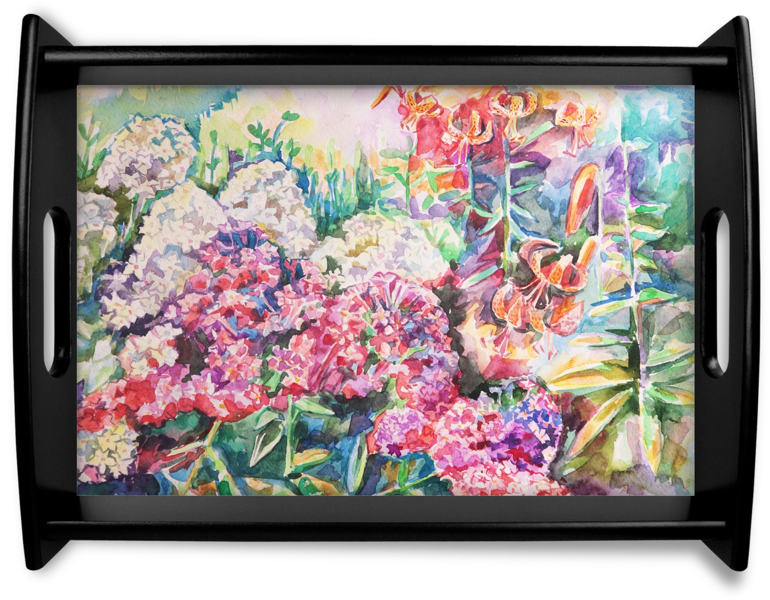 This serving tray with handles features square edges and two rounded sides, creating a very modern look. Each side is fabricated from a beautifully cut, natural wood. The bottom of the interior of the tray displays your customized design in bright, vibrant color. The tray is sold in both a black color and a natural wood look. Each variation of the wood serving tray has two sizes: Small, which is 14" x 10" x 2.25", and Large, which is 19.5" x 13.5" x 2.75".