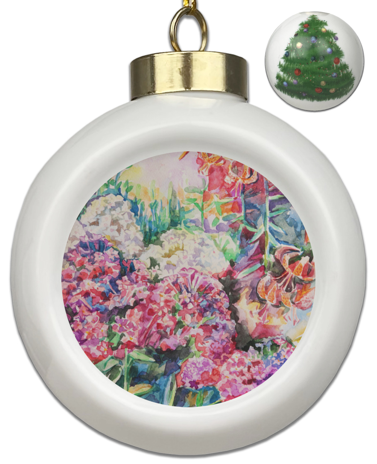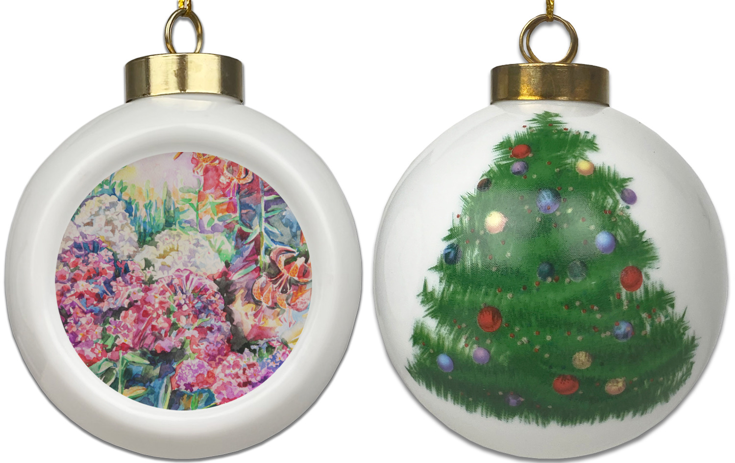 Our Christmas ornaments are a unique ceramic ball shape with a twist as it has a flat face to display your custom design! Select from one of our two design types - Christmas Tree or Poinsettia Garland - to adorn the curved back of your personal design. Each ornament measures 3H x 2.5W x 2D accompanied with a gold string accent for finishing touches to hang on your beautiful Christmas tree!