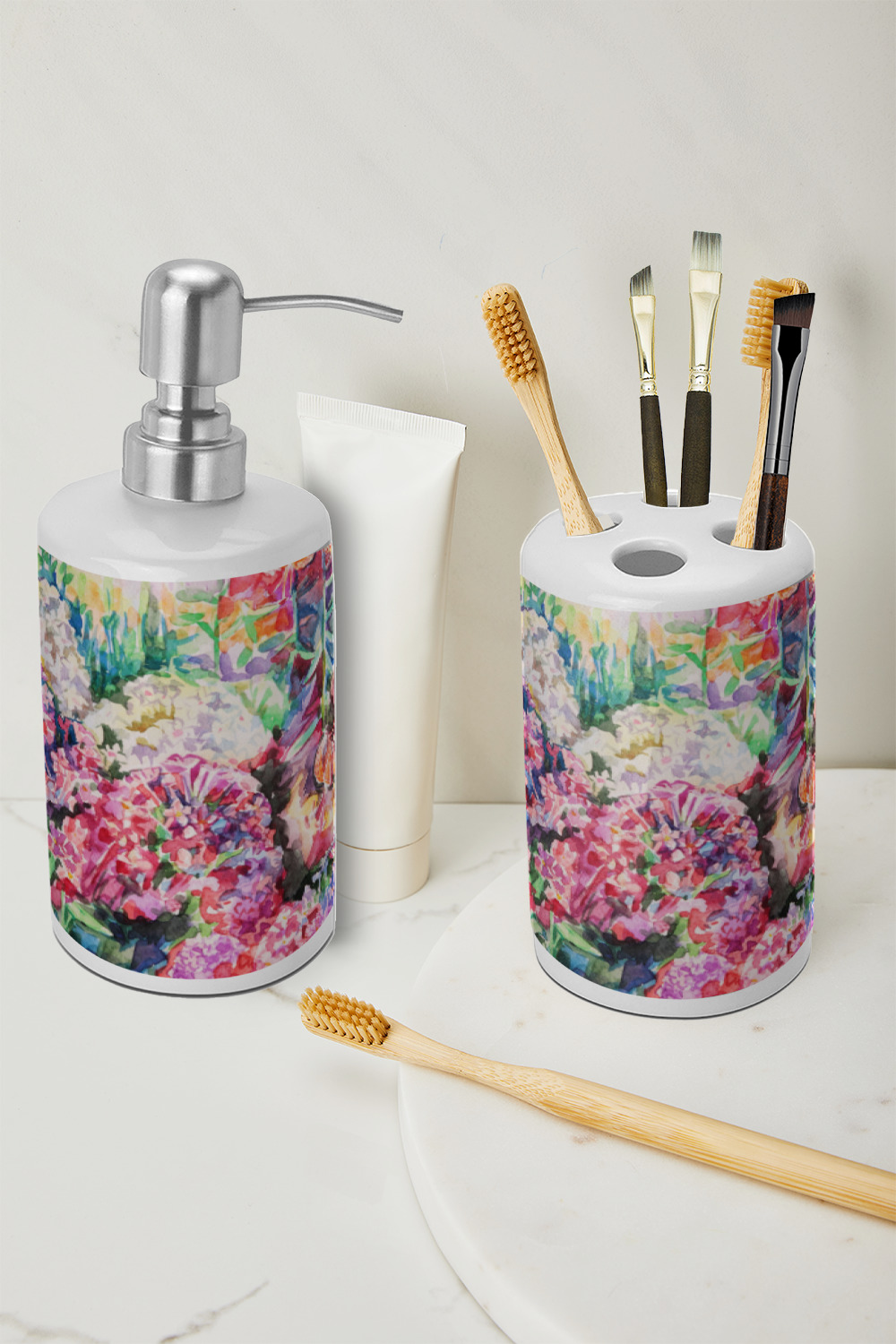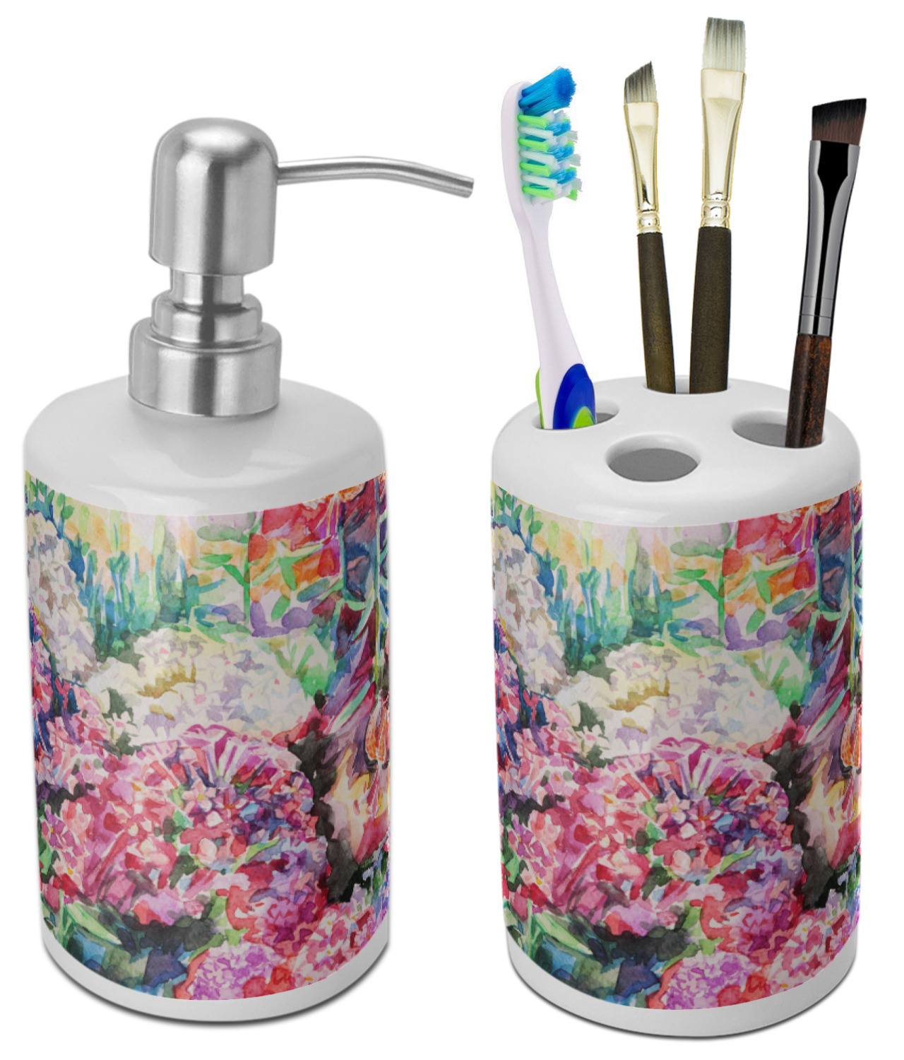 This two piece, ceramic bathroom set will add the perfect splash of color to any bathroom. This set includes one pump dispenser, ideal for soap or lotion, and one toothbrush holder with four holes. Although originally designed for toothbrushes, the holder will also hold make-up brushes, nail files, and other bathroom tools.