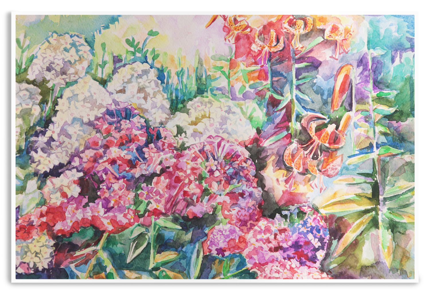 This handmade watercolor floral painting is absolutely stunning. The painting is set in a garden and it has my favorite flowers - the tiger lily in full bloom along with phlox / hydrangea. The tiger lilies are painted in those beautiful pink / orange colors. The phlox / hydrangea are painted in white and the pink / orange colors.