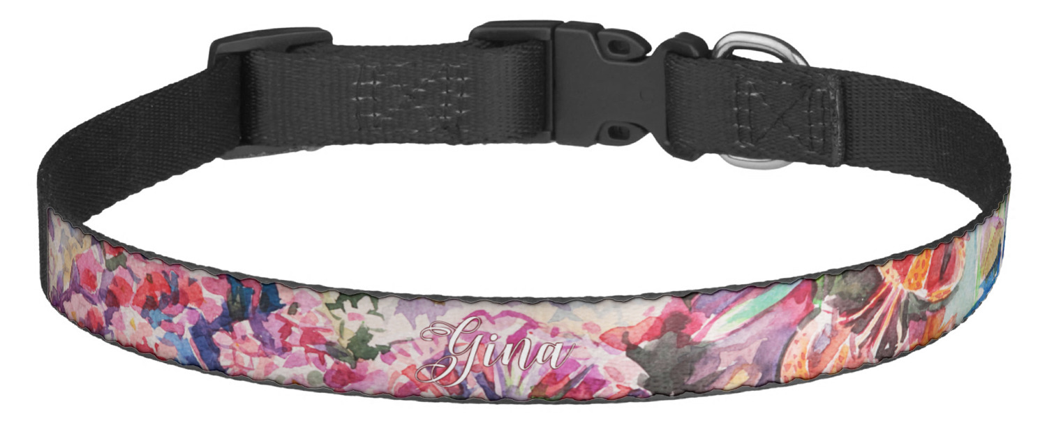 This sturdy collar, made from a durable nylon weave, will outlive your dog's episodes of excited tugging and pulling. Courtesy of its thick plastic buckle and adjuster, this collar is adjustable and accommodating of any dog. Structurally, the collar is a single piece of nylon weave that is sewn together, and features a solid metal loop where you can attach a leash or dog tag. We print and display your dog's name and pattern across the middle of the personalized dog collar.