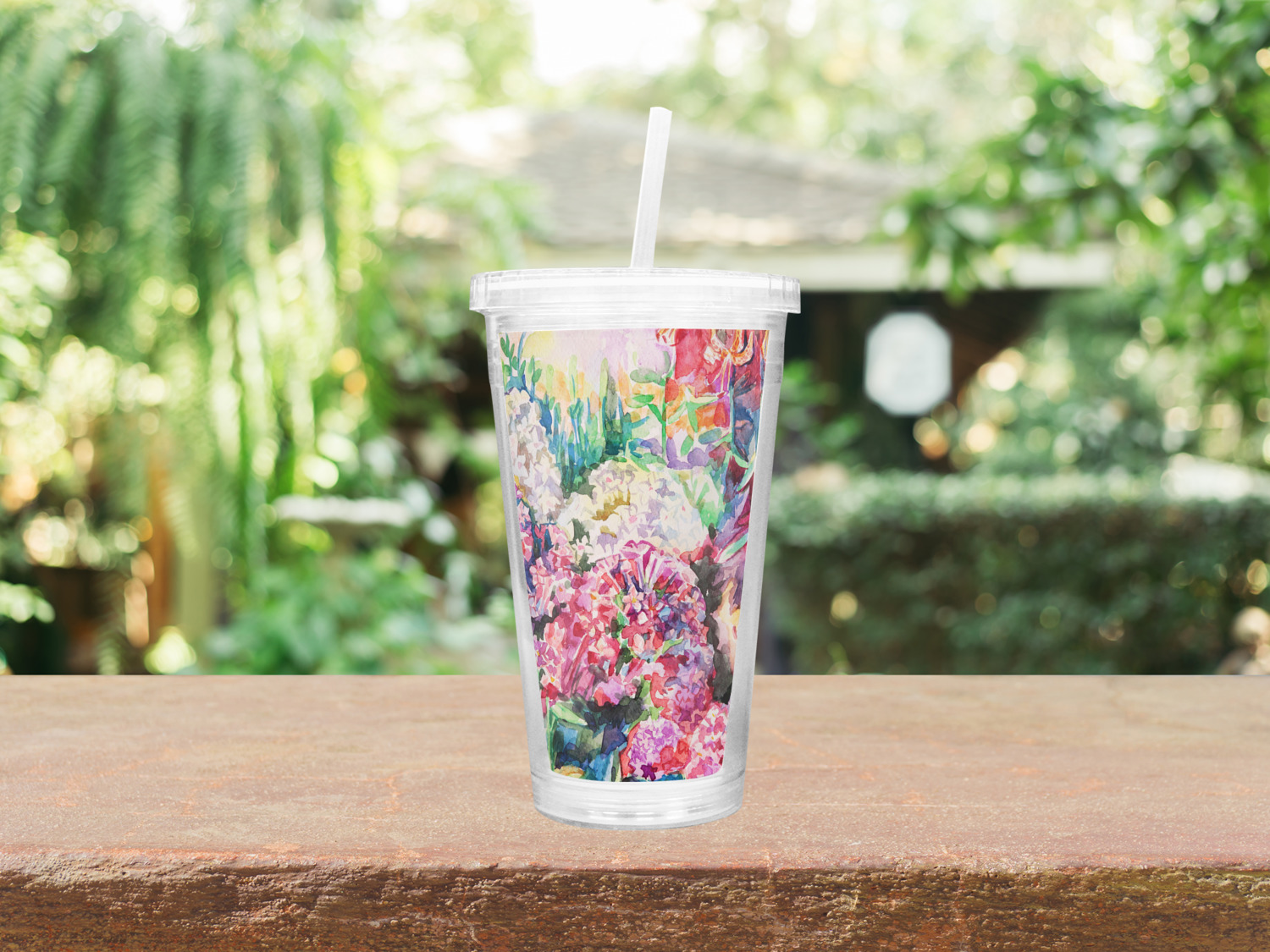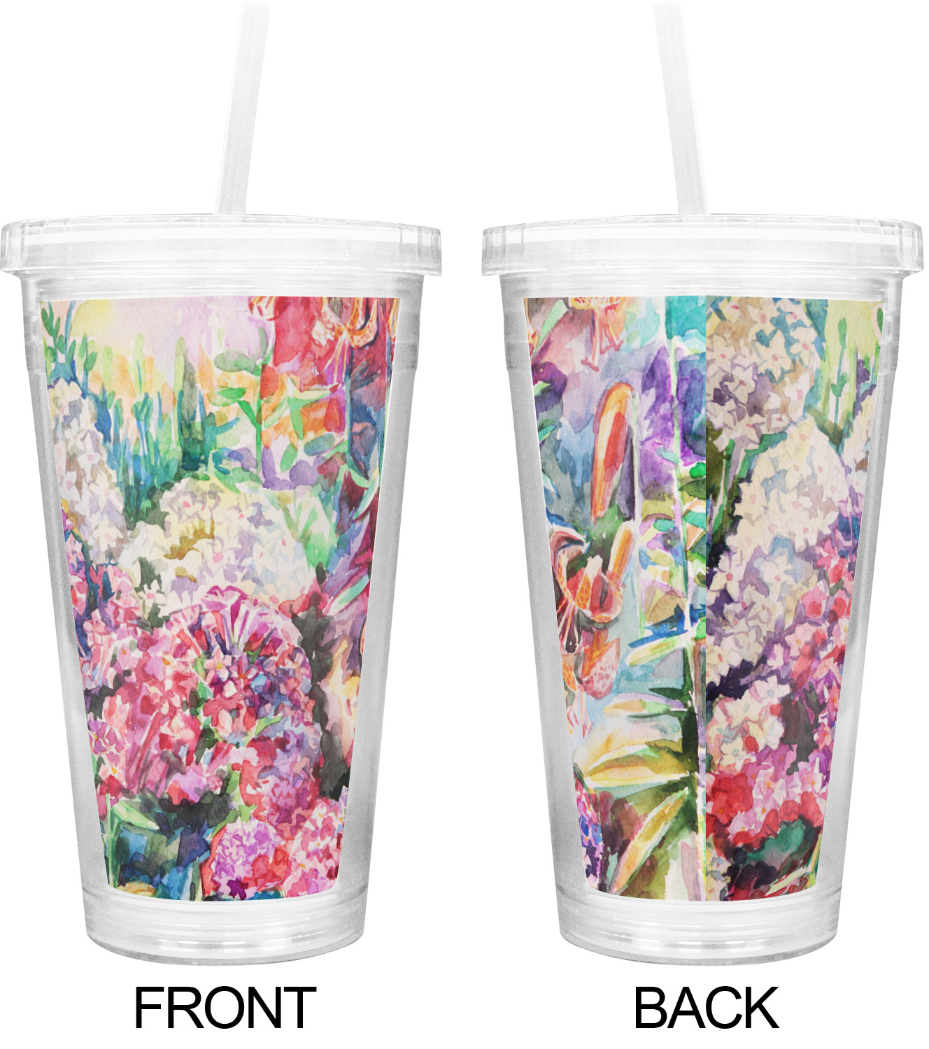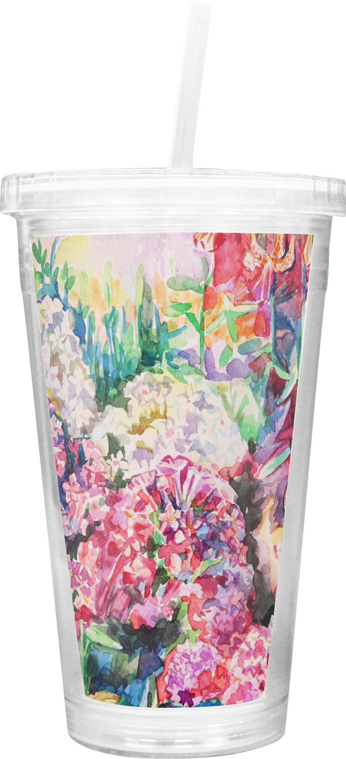 These BPA free tumblers with their double walls keep your drink cold and will not sweat on the outside; they have a clear acrylic top and a reusable straw with a ring around the bottom to keep the straw from falling out.