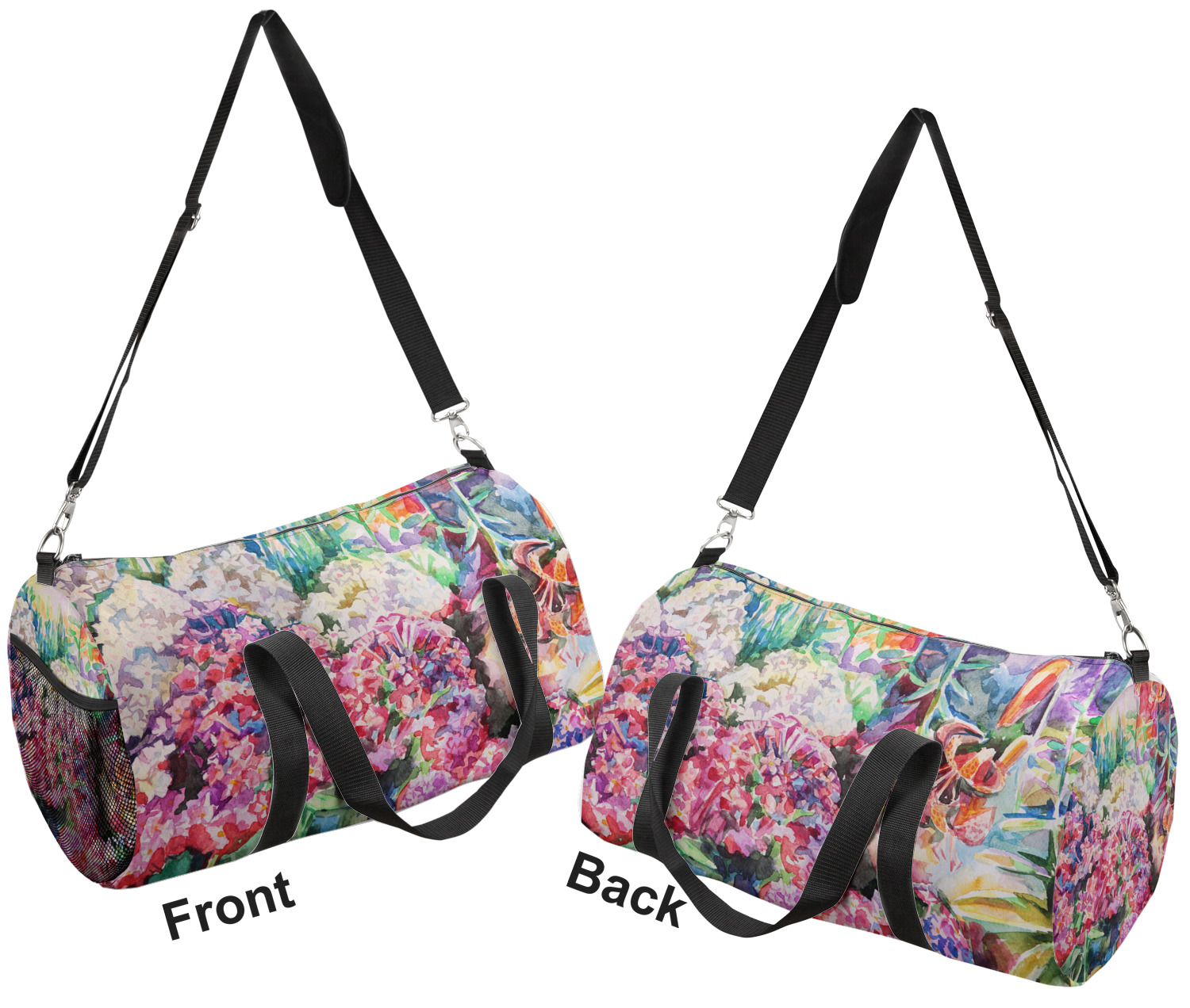 This duffle is a sturdy bag made of a canvas material. It comes in two sizes: Small (19"W x 9.5"H x 9.5"D) and Large (23"W x 12"H x 12"D). The bag is a cylindrical shape with a black adjustable strap and two handles. On one side is an elastic pouch to put a waterbottle or other small item. Your product will be sublimated with your design and is able to be designed on the front, back, and sides. Be sure to remember that the straps may cut into parts of your design if you upload your own artwork.