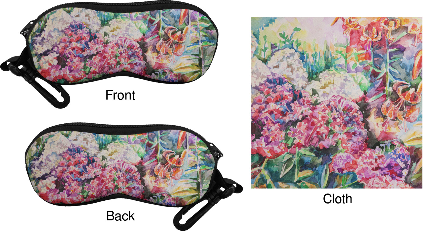 The cases have the design on both sides, a black zipper, and clips for hanging on a belt buckle or purse strap and also include matching lens cloths.