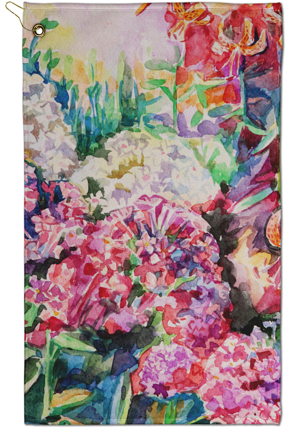 The towel is fully printed / patterned on the front polyester side; and is white on terrycloth cotton backside. The towel has grommet and a pear spring clip in the top left corner. Our golf towels are available in 100s of different prints and patterns.