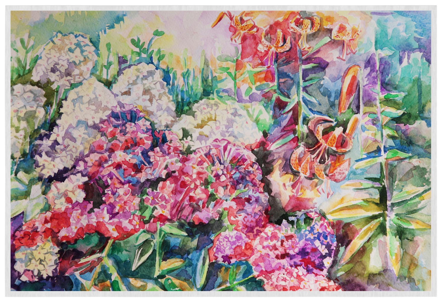 This handmade watercolor floral painting is absolutely stunning. The painting is set in a garden and it has my favorite flowers - the tiger lily in full bloom along with phlox / hydrangea. The tiger lilies are painted in those beautiful pink / orange colors. The phlox / hydrangea are painted in white and the pink / orange colors.