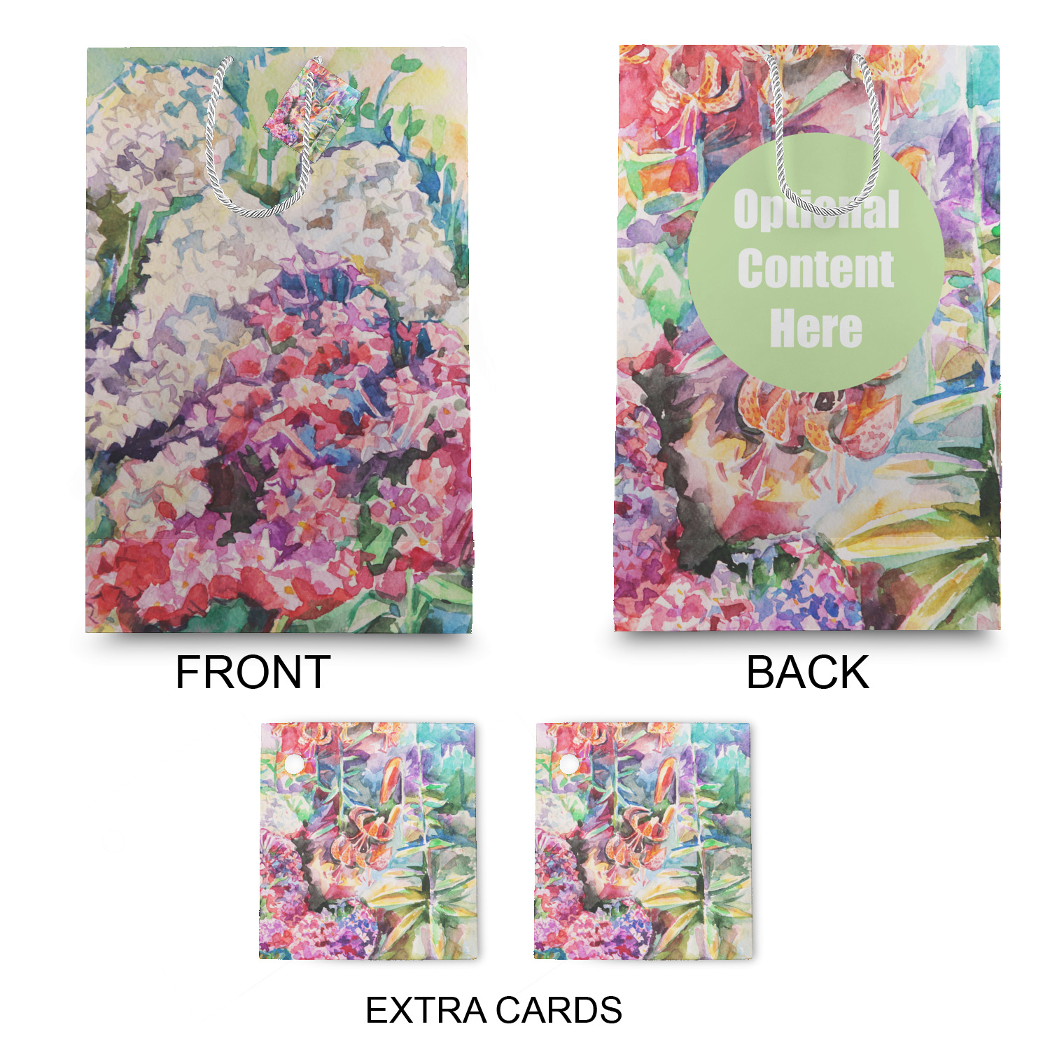 The bottom of the bag has a cardstock base to make the base more sturdy to hold up to all of your gifts. Each bag comes with one card on the rope handle and at least 1 extra card.