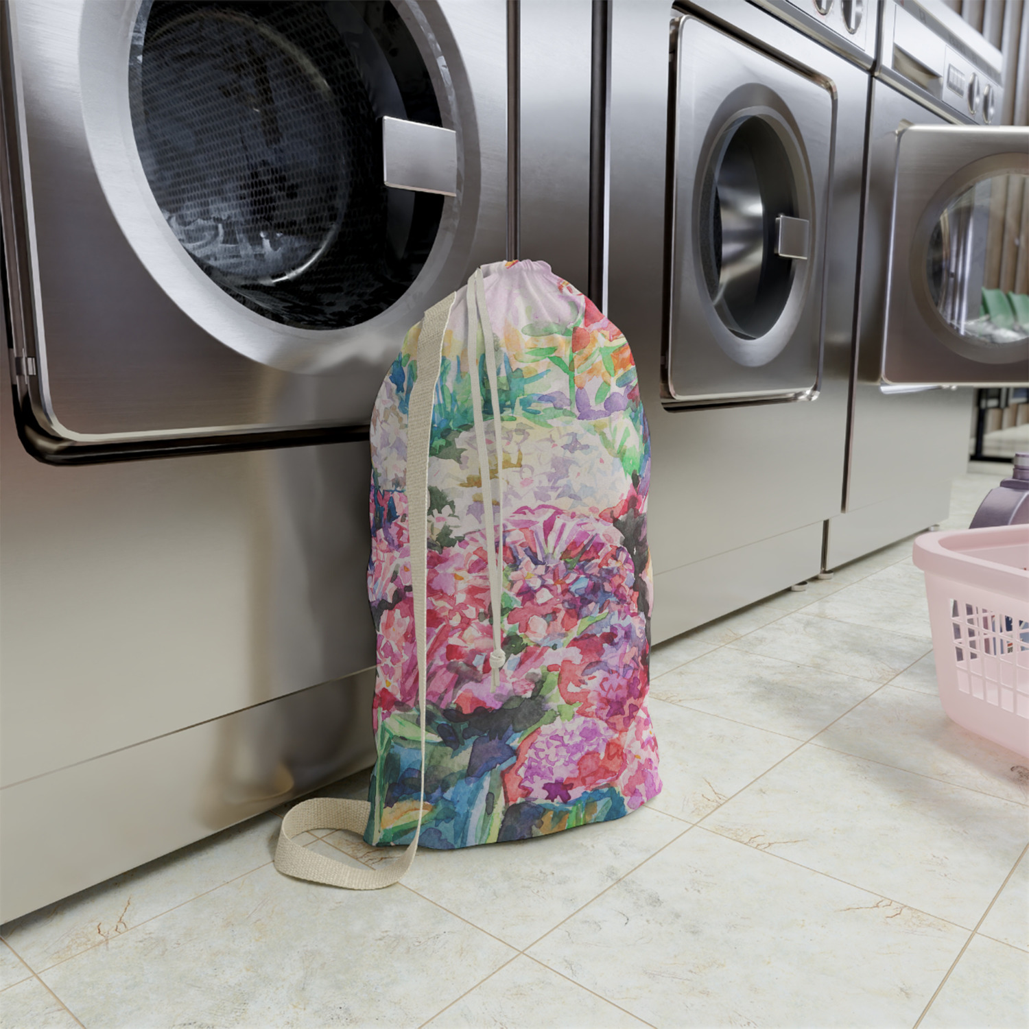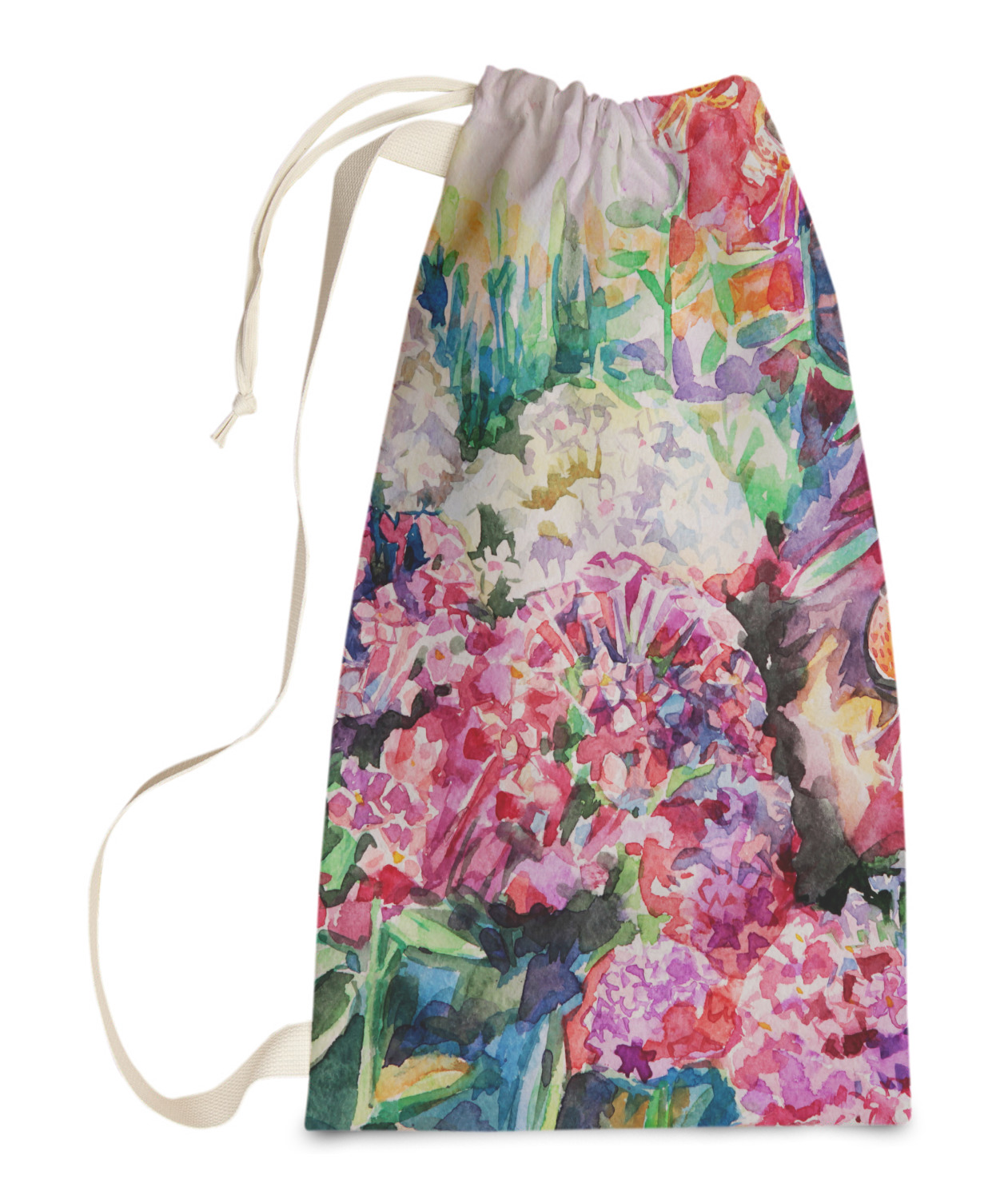 Our laundry bags are handmade in the USA; The fabric is printed using dye sublimation. The fabric is then cut and the grommets are added for the drawstring closure. The laundry bag is then sewn and the drawstring is fed through and knotted to create the cinch closure.