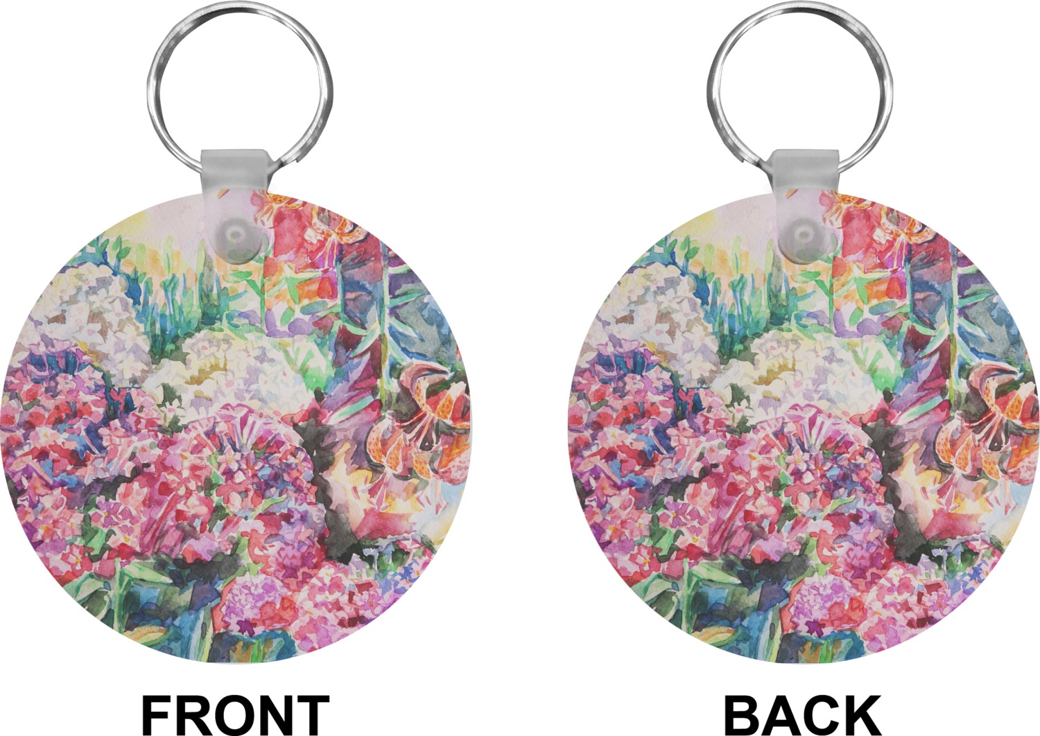 Our personalized keychains attach to the included metal, split key ring with a plastic, removable snap. Since a metal ring is included with your purchase, you have the liberty to keep your keys together on the ring, with or without your unique keychain. We offer this keychain in three different shapes: circle, heart, or diamond. We print your personalized design(s) on both sides of the key chain, and the surface has a glossy, reflective finish that only emphasizes your design. Each keychain is approximately 2.25 by 2.25 inches.
