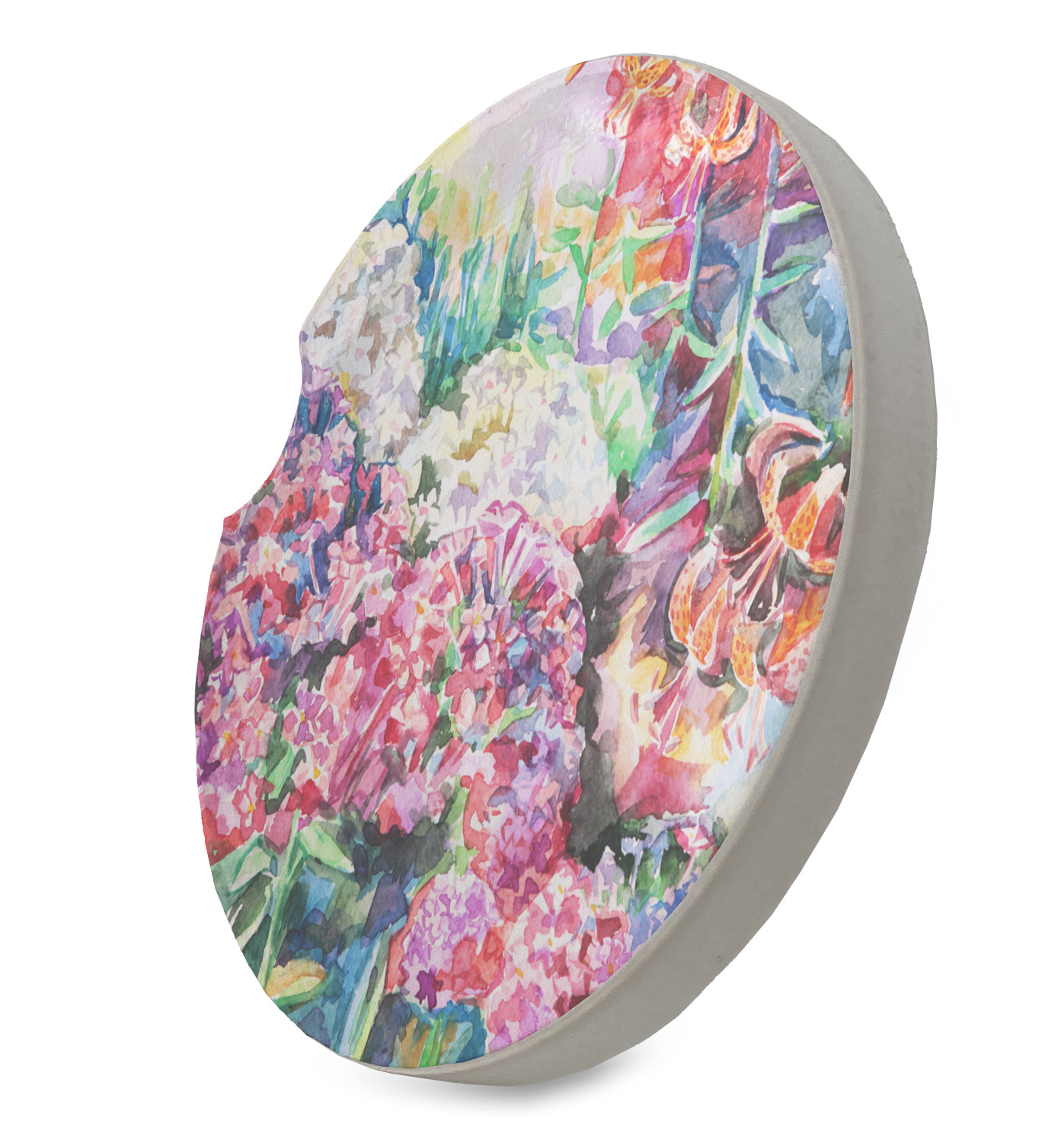These sandstone coasters are round, robust, and feature a smoothed glossy side to exhibit your customized design. With a 2.5 inch diameter, these stone coasters will fit snugly inside most cup holders. This model also features a semi-circle shaped divot that allows for easy removal, despite the tight fit. You can purchase these car cup holder coasters in a pair, or singularly, depending on your needs.