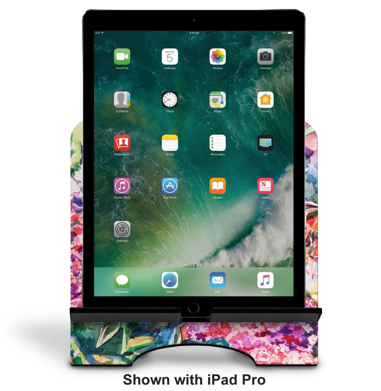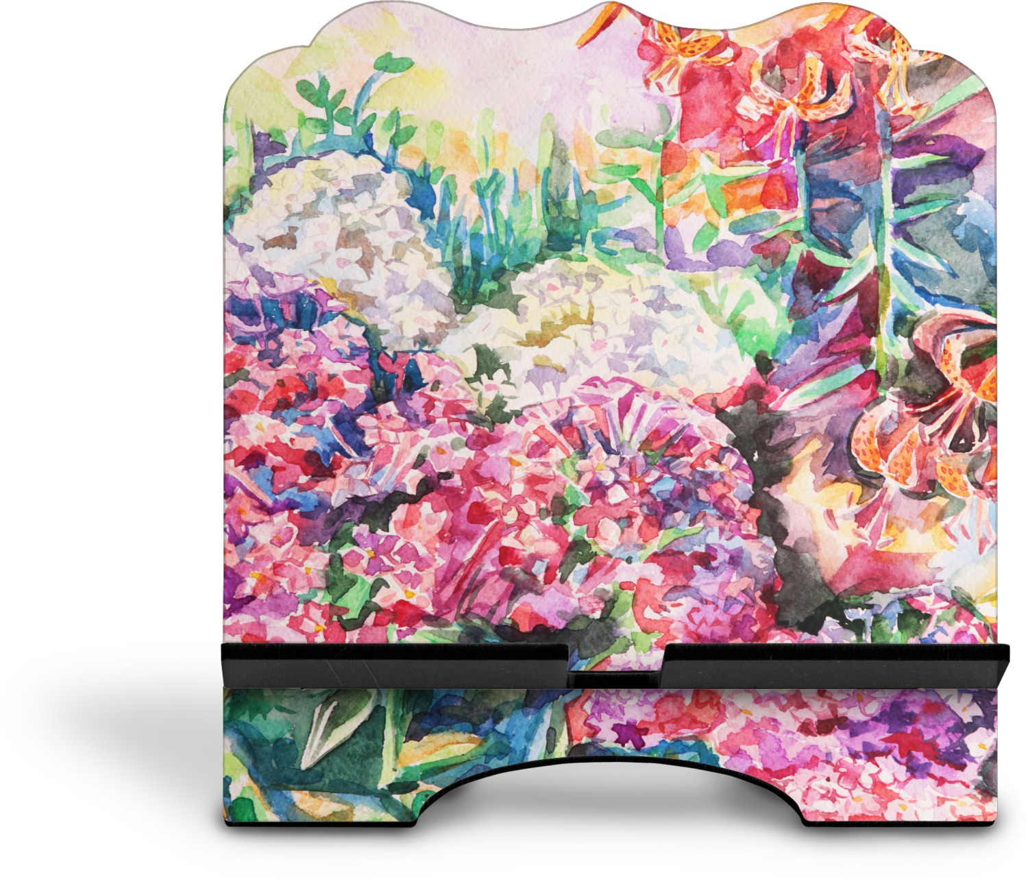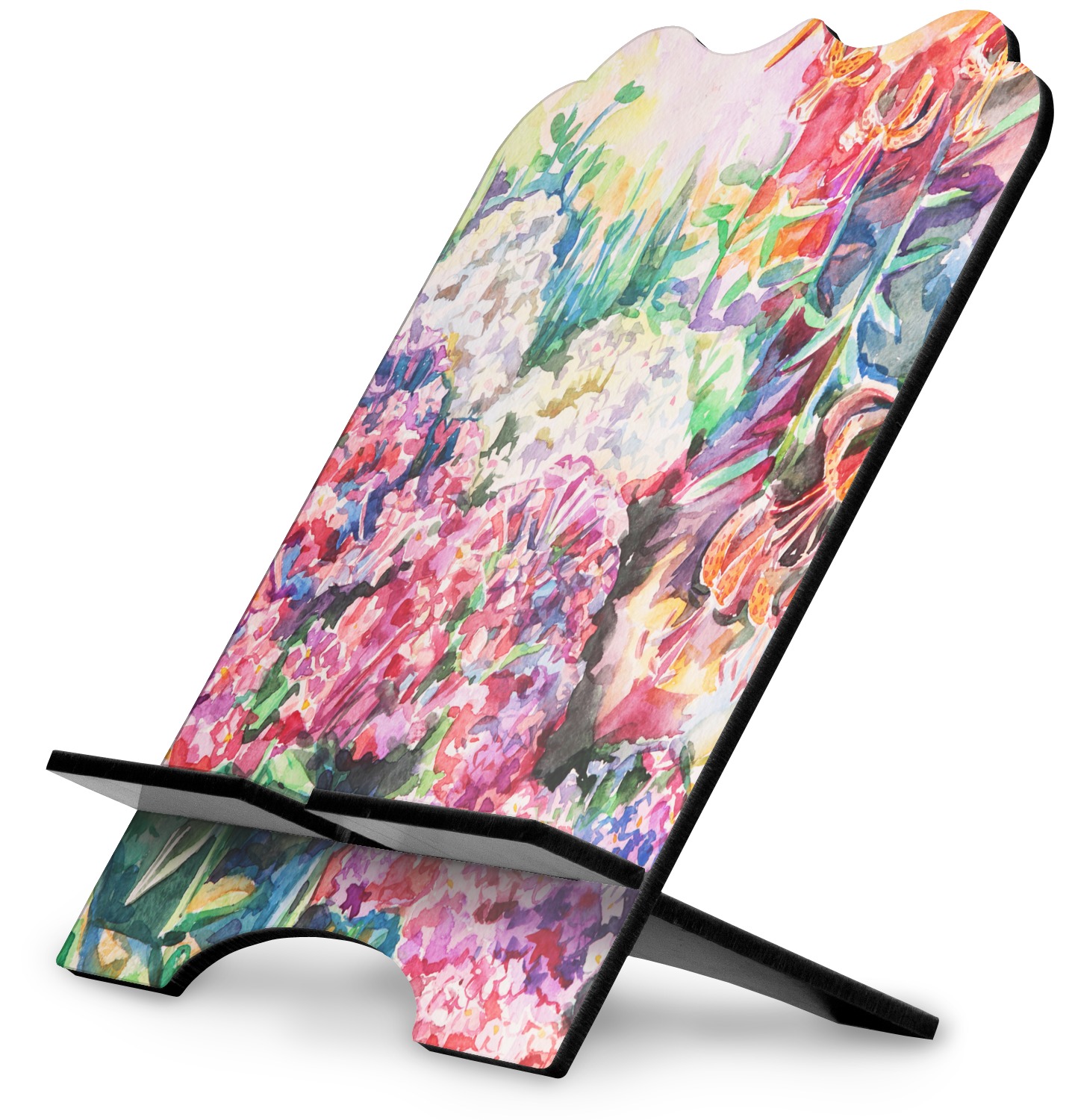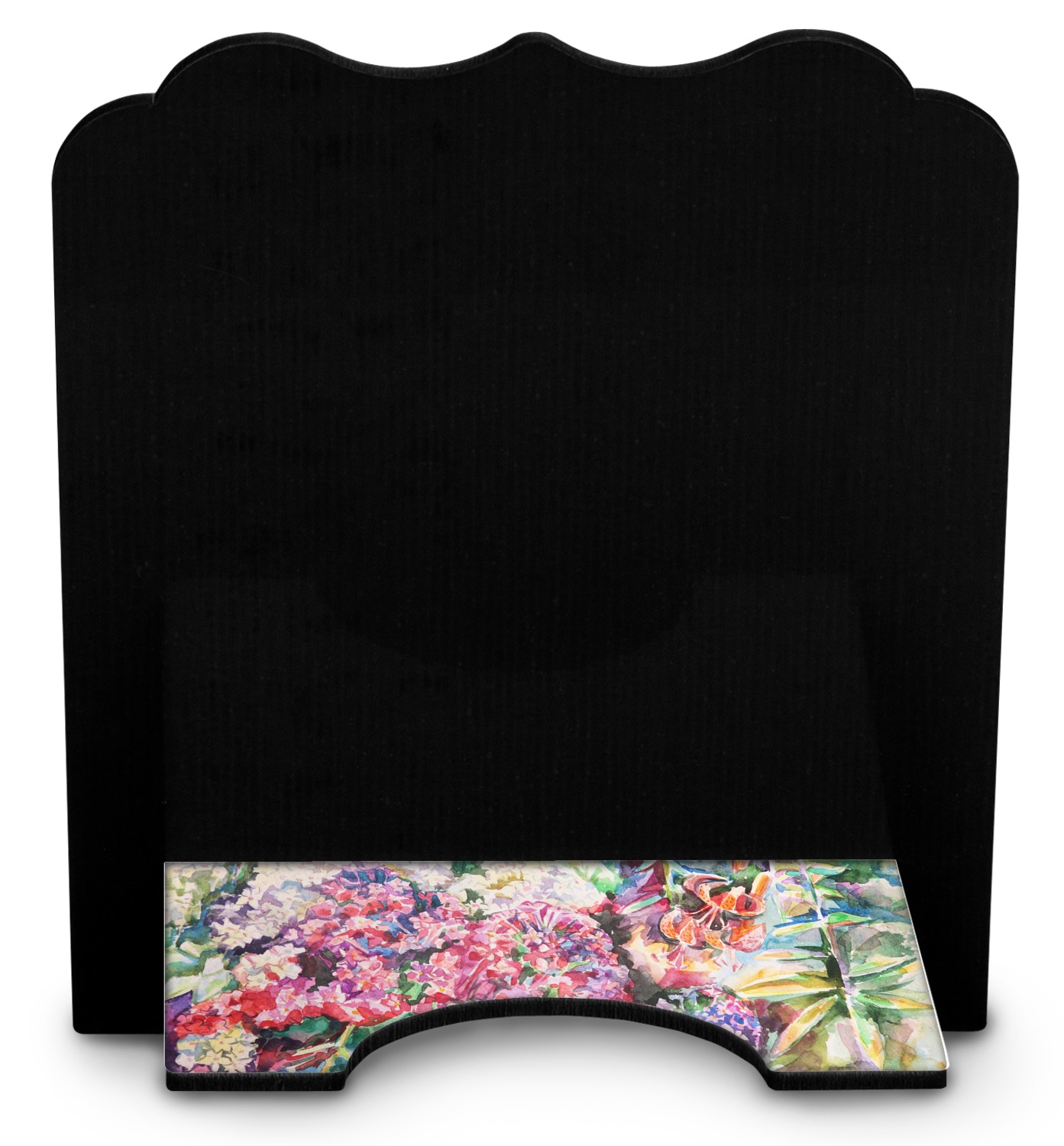 The stand is comprised of two hardboard pieces that fit snugly together and stabilize one another. The bottom part of the iPad stand supports your tablet, and has space for your tablets charger while in use. At 9.25" x 11.5", this tablet mount can support a device between the sizes of the iPad Pro and the iPad Mini 2. The uppermost part of the stand features a decorative, curved edge for a classy, suave appearance. We print your customization atop the face of the stand, in vibrant color. The remaining sides are colored a sleek black.