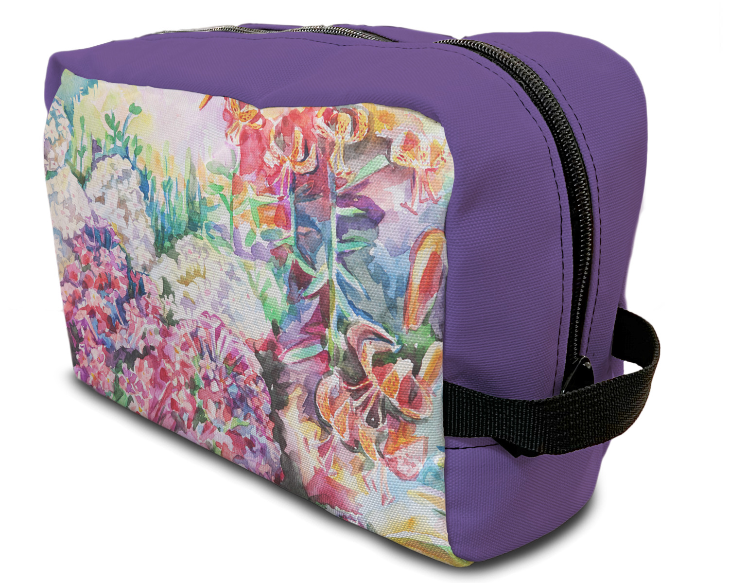 Our toiletry bag has the traditional dopp kit design i.e. a side to side zippered closure, giving you easy access to all the contents inside and a sturdy handle on one side of the bag. The canvas fabric for dopp kits is printed, then cut and sewn here in the USA.