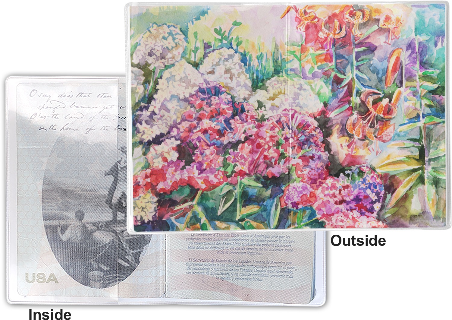 This cover is made of a sturdy clear vinyl with a personalized vinyl insert inside. There is a large and a small pocket on either side to hold the covers of your passport easily and firmly. The passport holder is approximately 7.5" x 5.25", the perfect size to snugly fit your passport. This slim cover is the perfect way to protect your passport without being one more bulky item you have to carry.