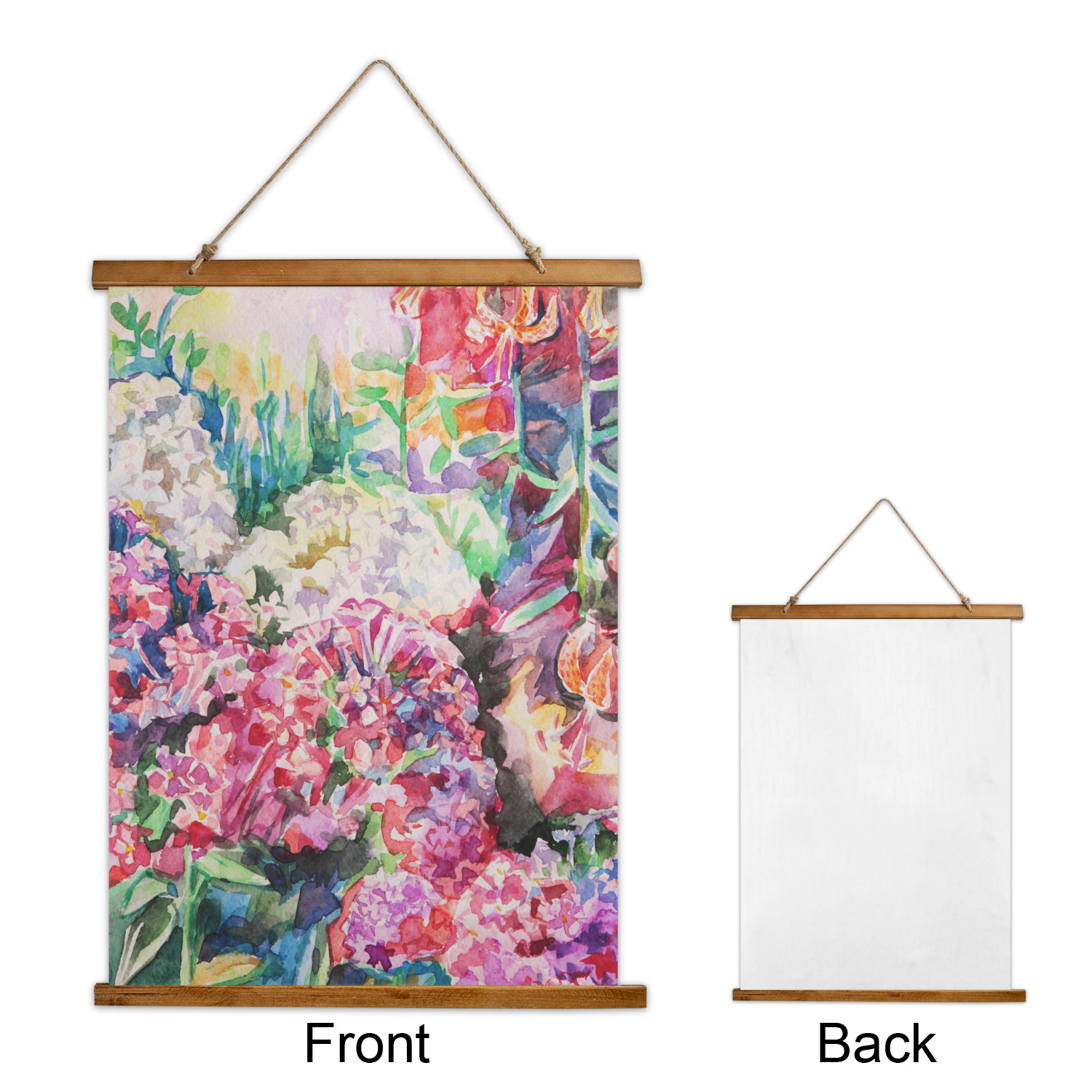 Made in two different orientations - portrait or landscape - both are 26" x 36". Your design is printed on a high quality polyester fabric with hemmed edges. The wood on the top and bottom of the tapestry is 1.25" tall and 0.25" thick and there are two pieces on top and bottom which sandwich the fabric.