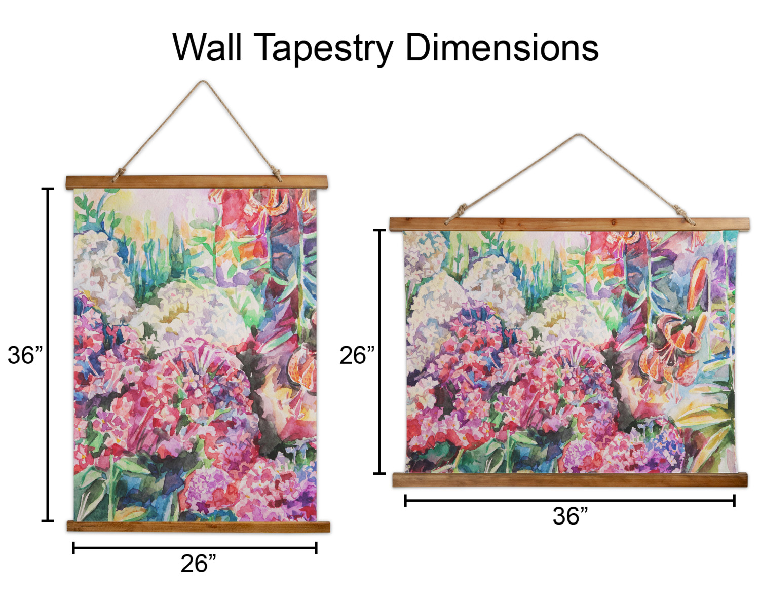 Made in two different orientations - portrait or landscape - both are 26" x 36". Your design is printed on a high quality polyester fabric with hemmed edges. The wood on the top and bottom of the tapestry is 1.25" tall and 0.25" thick and there are two pieces on top and bottom which sandwich the fabric.