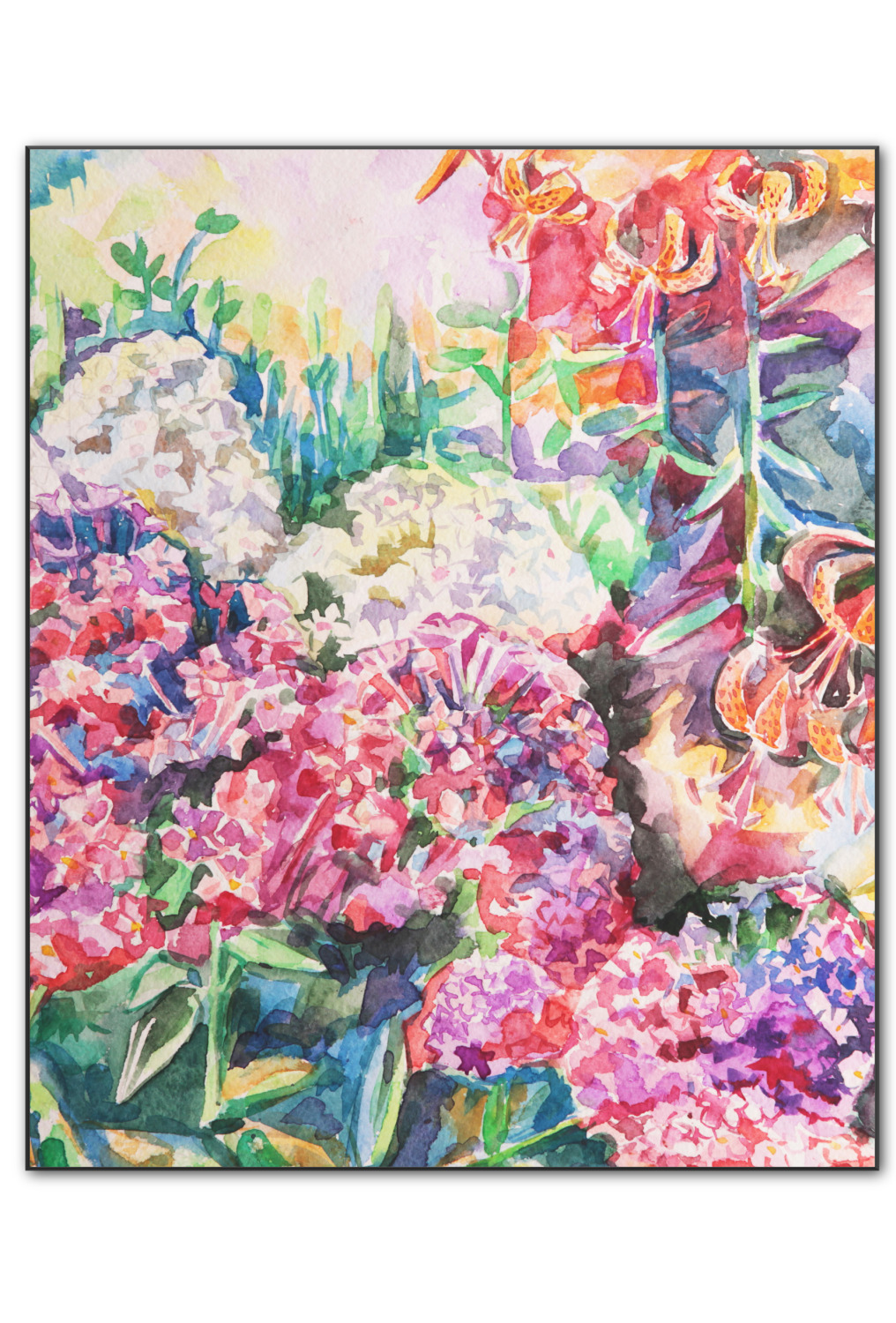 This handmade watercolor floral painting is absolutely stunning. The painting is set in a garden and it has my favorite flowers - the tiger lily in full bloom along with phlox / hydrangea. The tiger lilies are painted in those beautiful pink / orange colors. The phlox / hydrangea are painted in white and the pink / orange colors.
