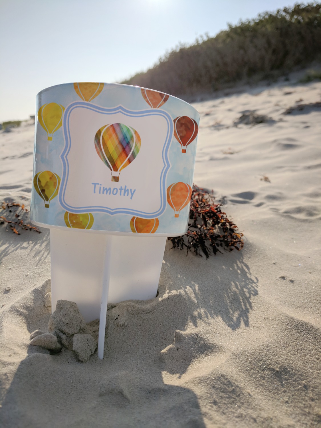 We chose to personalize it with a decorative square label and our graphics & text style. We chose to use a hot air balloon as our graphic from our transportation collection and used a name for personalization. We chose baby blue for our color to coordinate with the sky.