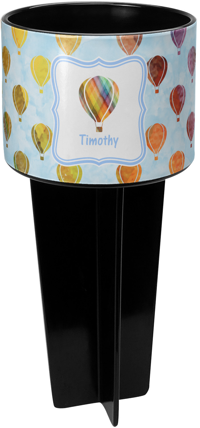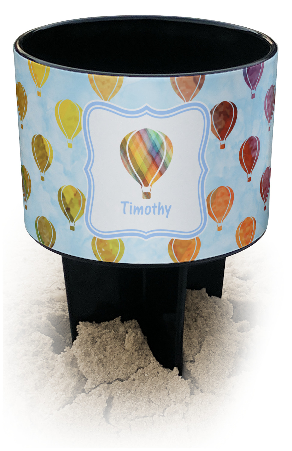 This cup holder has a large stake at its bottom that anchors it to the sand or ground below, while the cup holder rests above the stake. The entire drink holder is made of durable plastic and displays your customization around the cup holder portion. We sell these personalized beach spikers in two different colors: black and white.