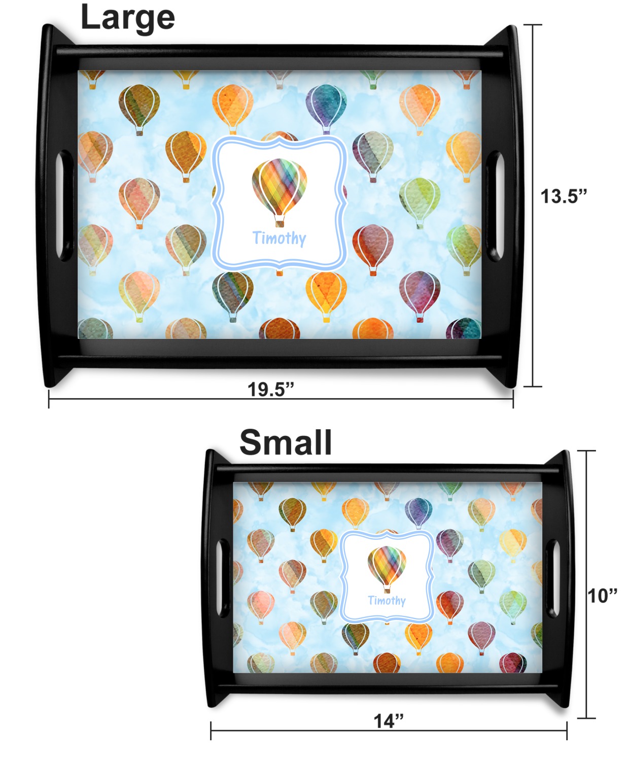 This serving tray with handles features square edges and two rounded sides, creating a very modern look. Each side is fabricated from a beautifully cut, natural wood. The bottom of the interior of the tray displays your customized design in bright, vibrant color. The tray is sold in both a black color and a natural wood look. Each variation of the wood serving tray has two sizes: Small, which is 14" x 10" x 2.25", and Large, which is 19.5" x 13.5" x 2.75".