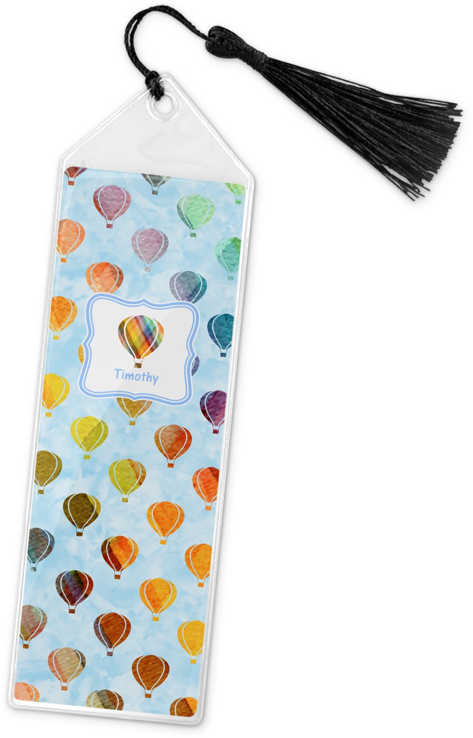 Your personalized bookmark is made of a sturdy, clear vinyl, and is approximately 7.5" x 2.25". We display your personalization on vinyl inserts that are placed on both sides. Accompanying each book marker is a black, fringe tassel that attaches to the reinforced, triangular header.