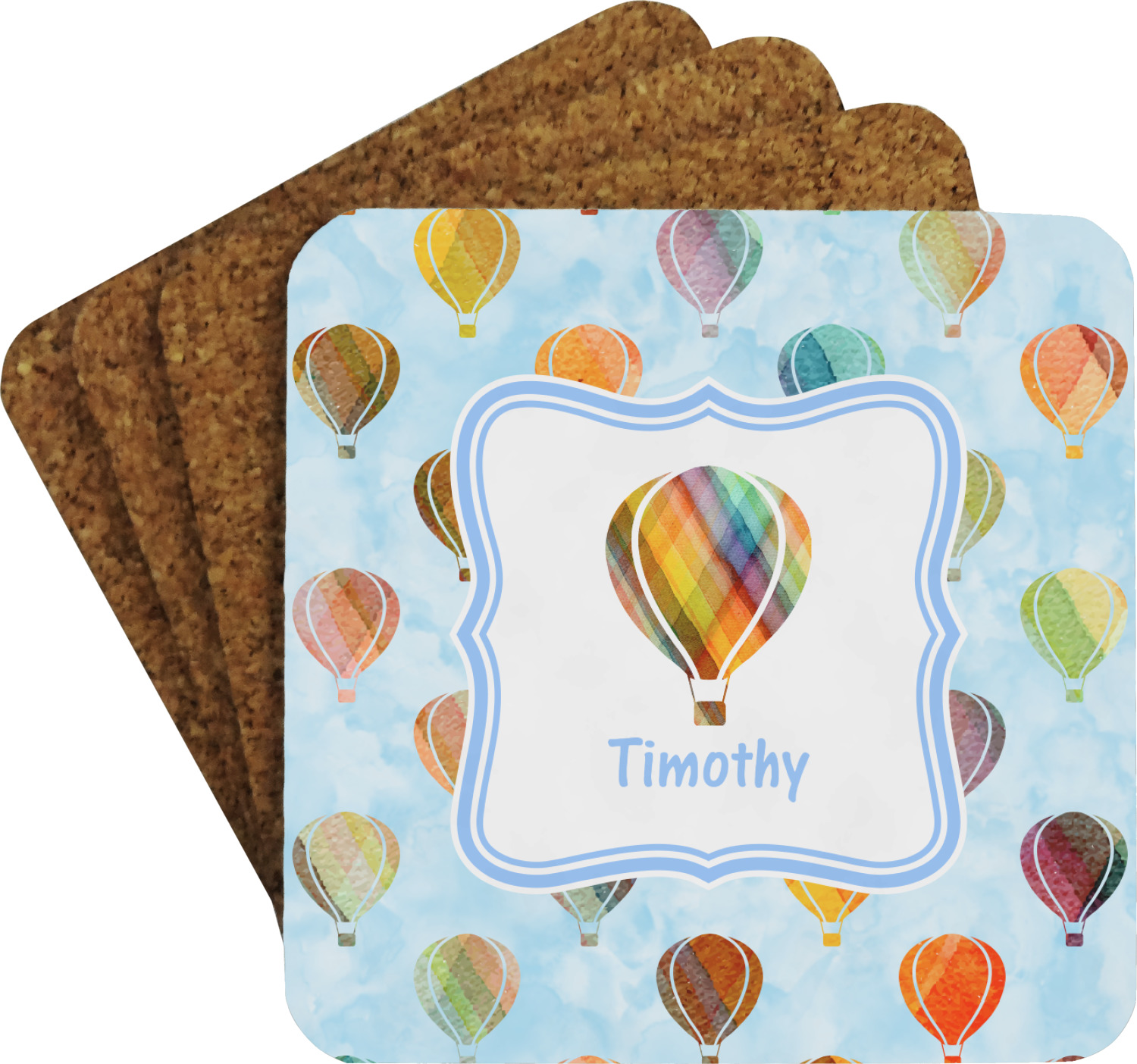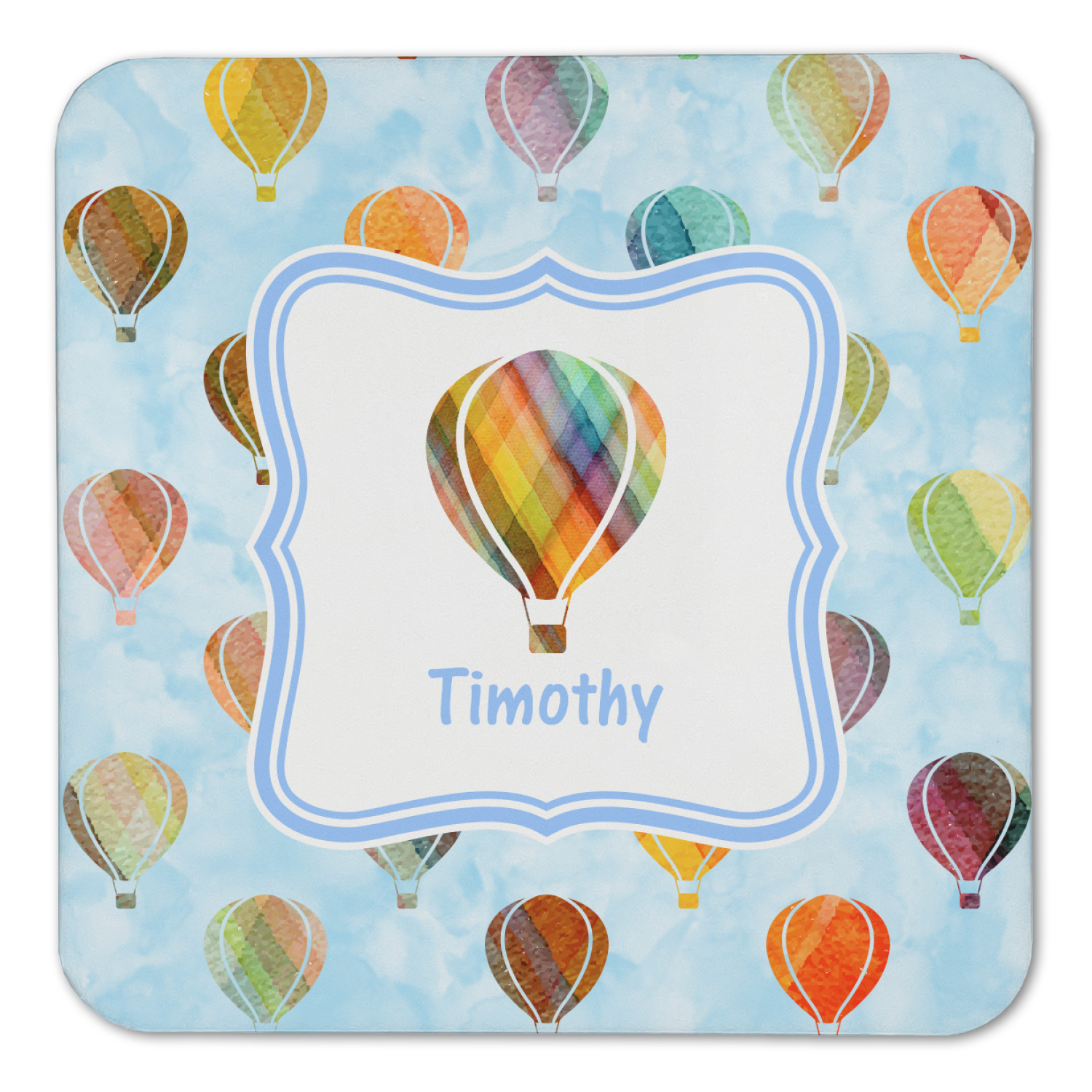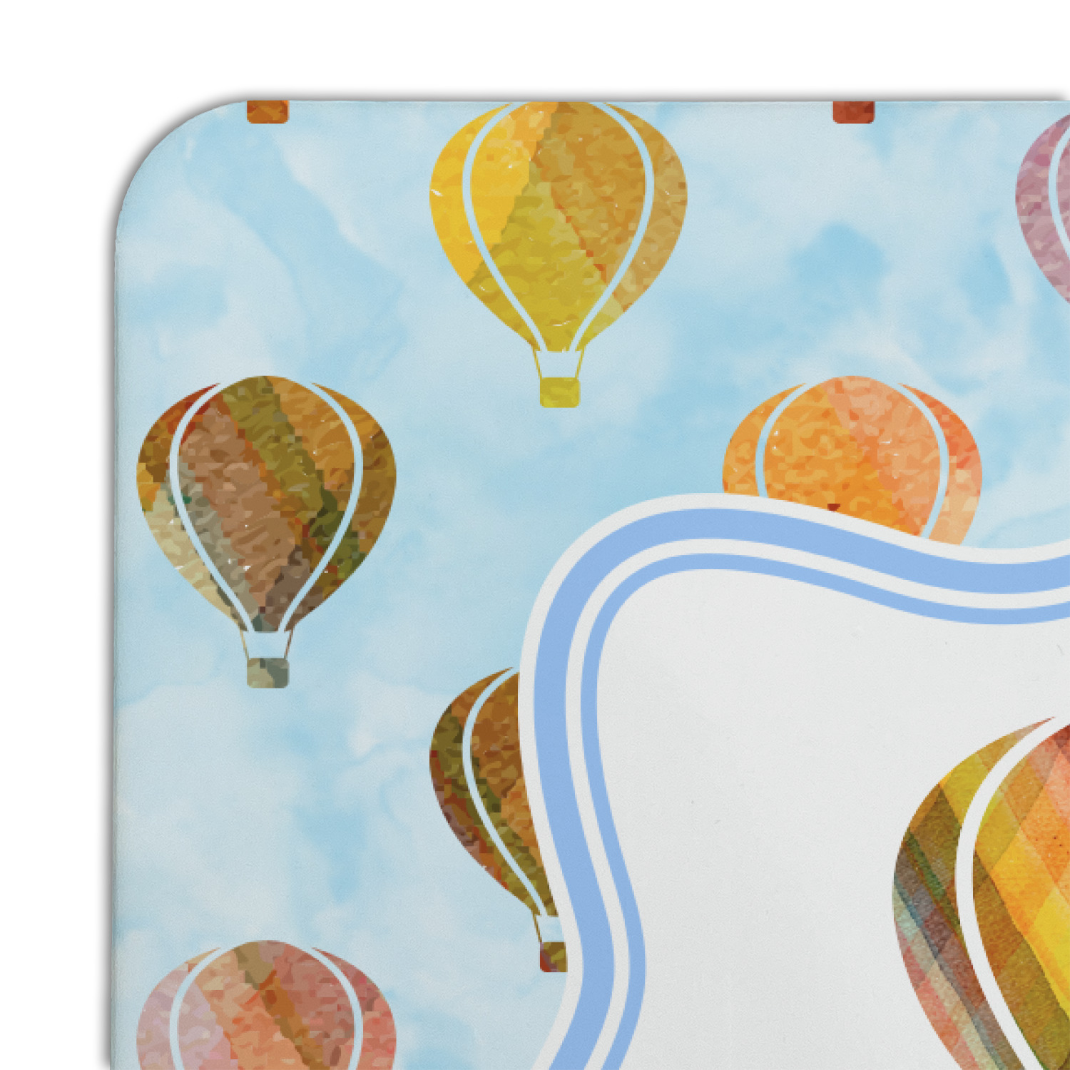 We chose to personalize it with a decorative square label and our graphics & text style. We chose to use a hot air balloon as our graphic from our transportation collection and used a name for personalization. We chose baby blue for our color to coordinate with the sky.