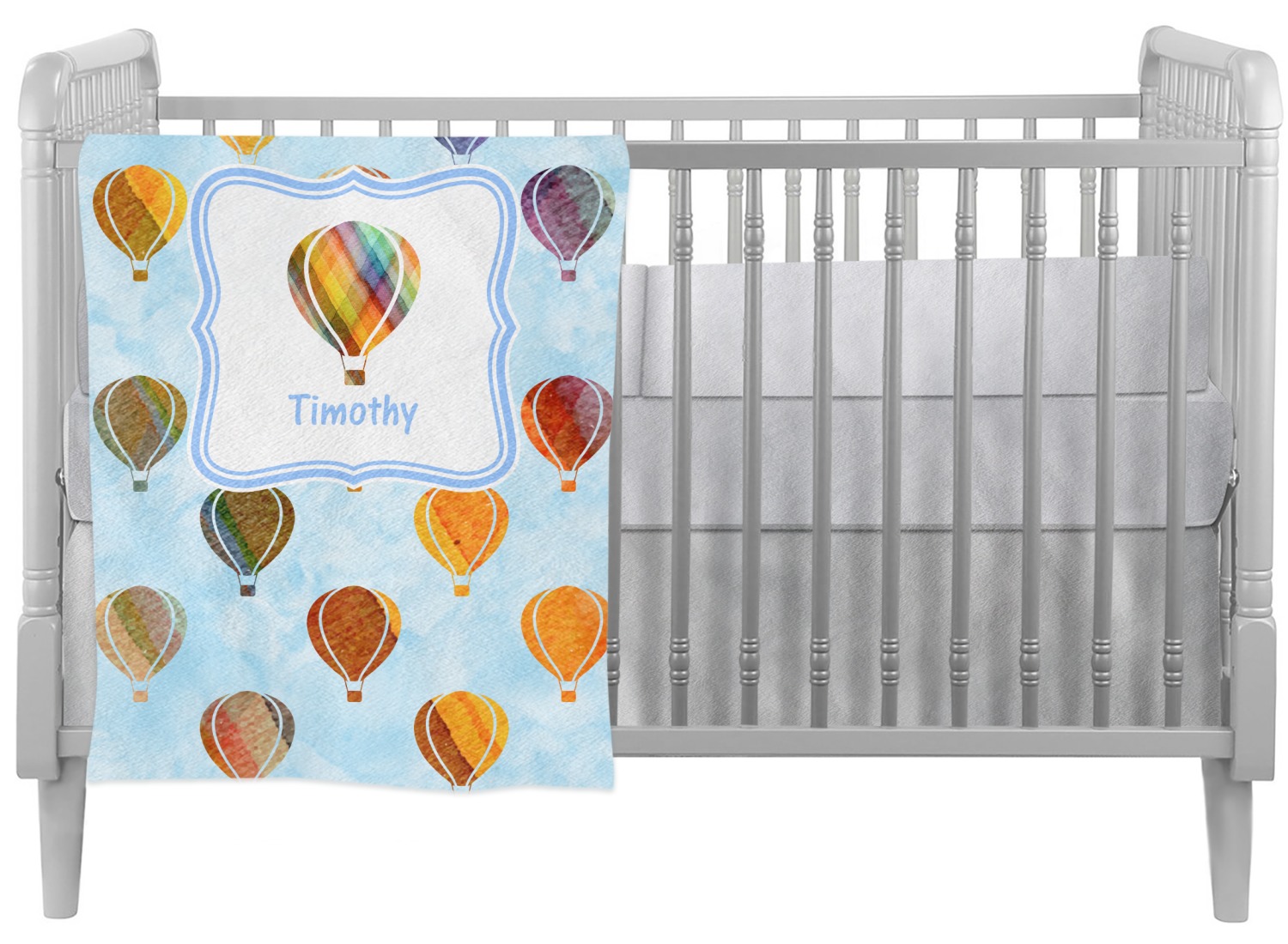 We chose to personalize it with a decorative square label and our graphics & text style. We chose to use a hot air balloon as our graphic from our transportation collection and used a name for personalization. We chose baby blue for our color to coordinate with the sky.