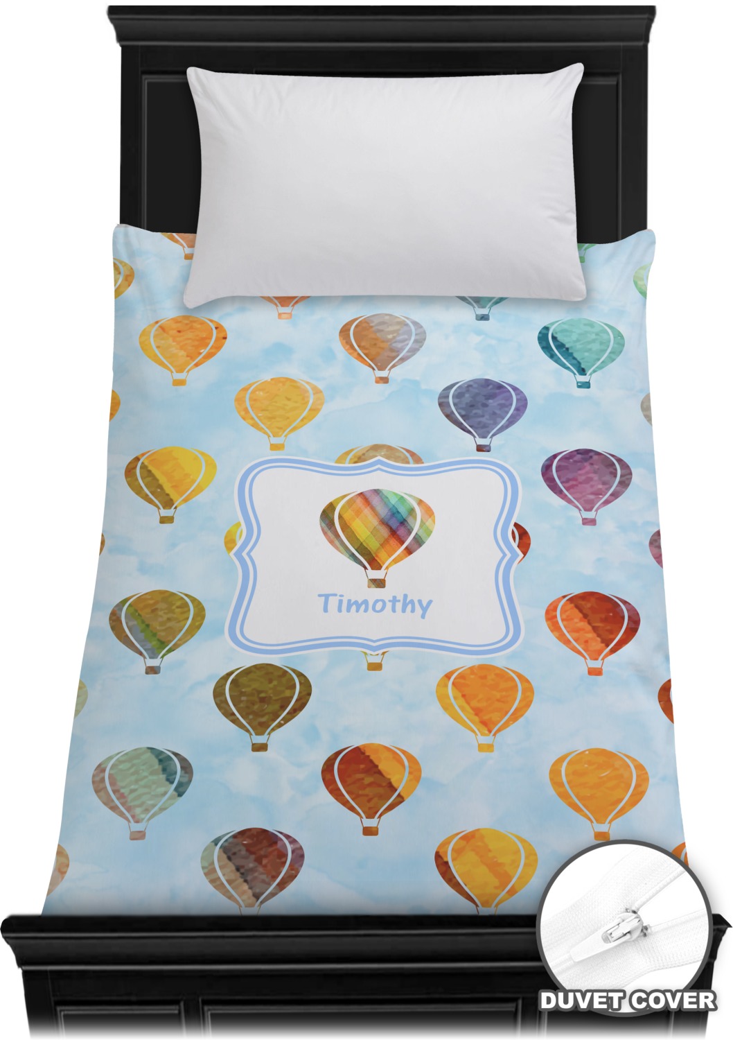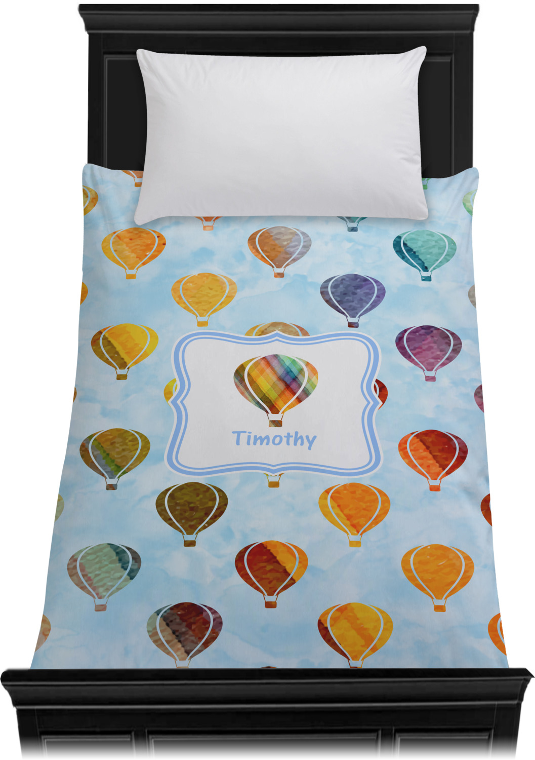 We chose to personalize it with a decorative square label and our graphics & text style. We chose to use a hot air balloon as our graphic from our transportation collection and used a name for personalization. We chose baby blue for our color to coordinate with the sky.