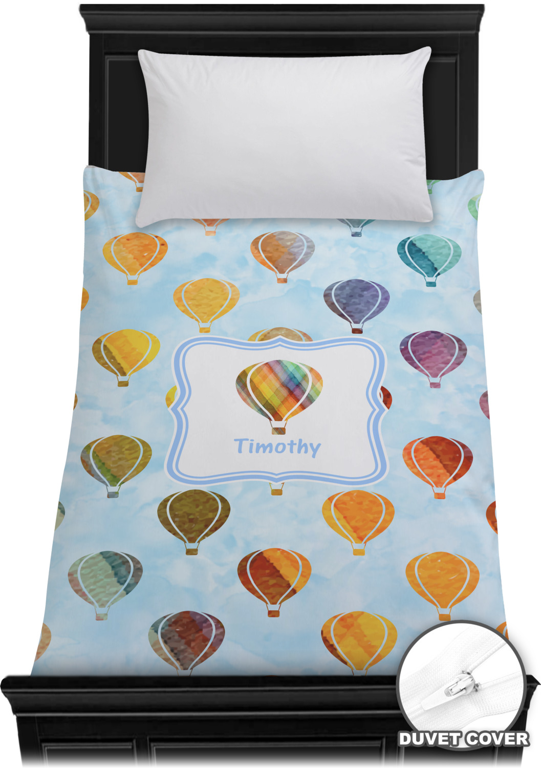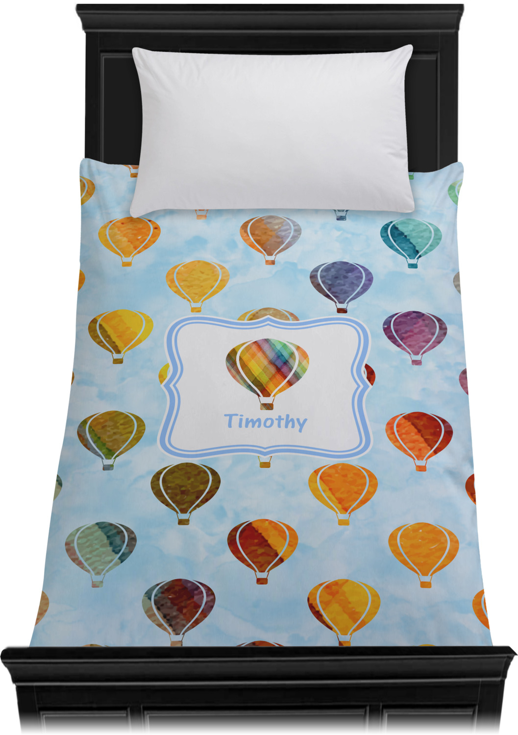 We chose to personalize it with a decorative square label and our graphics & text style. We chose to use a hot air balloon as our graphic from our transportation collection and used a name for personalization. We chose baby blue for our color to coordinate with the sky.