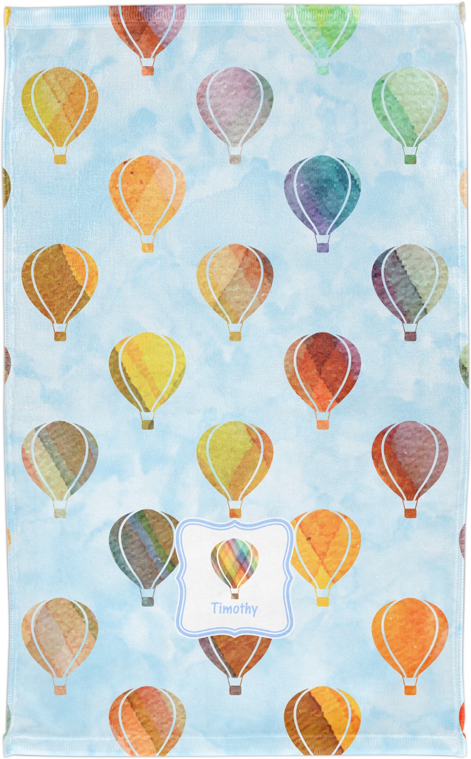 We chose to personalize it with a decorative square label and our graphics & text style. We chose to use a hot air balloon as our graphic from our transportation collection and used a name for personalization. We chose baby blue for our color to coordinate with the sky.