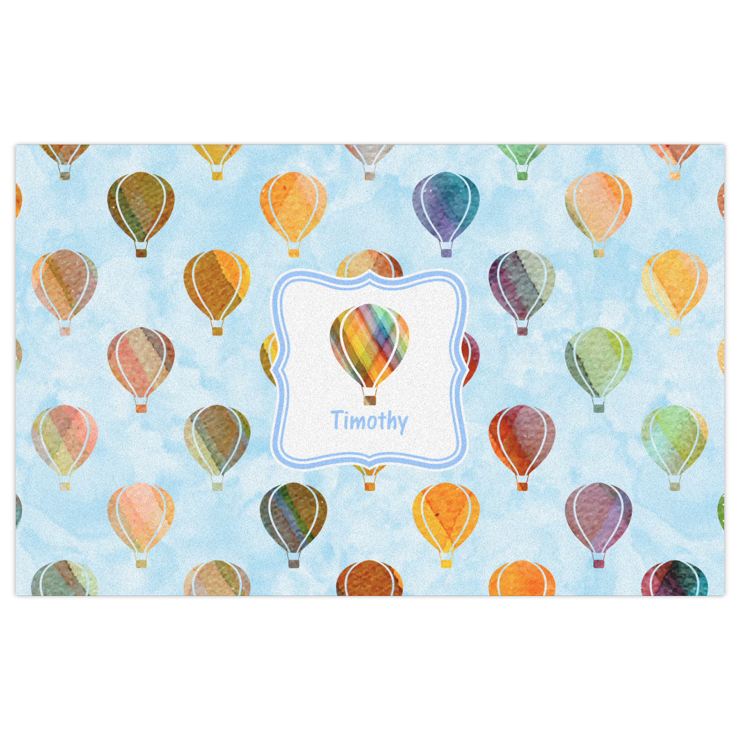 This watercolor hot air balloons design is simply adorable. The design background is the blue sky done in watercolor. The hot air balloons are also done in watercolors; in shades of oranges, reds, greens & teals.
