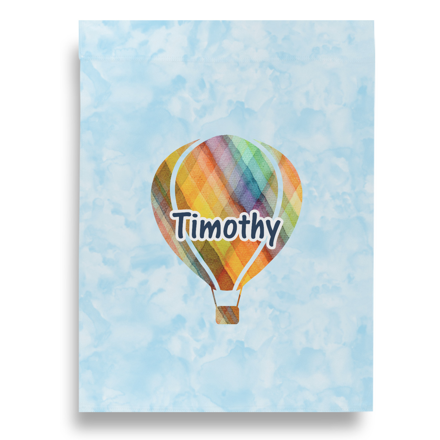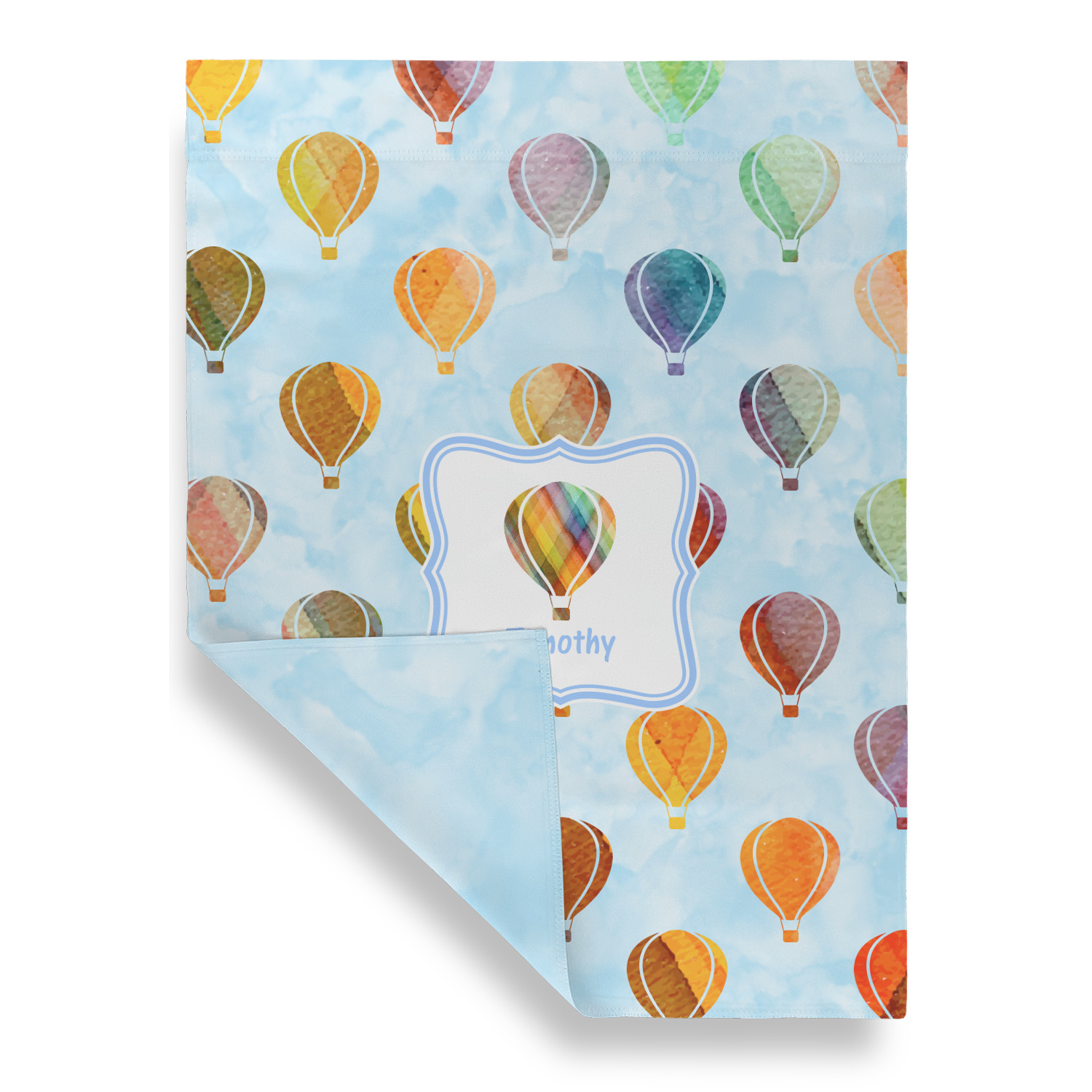 We chose to personalize it with a decorative square label and our graphics & text style. We chose to use a hot air balloon as our graphic from our transportation collection and used a name for personalization. We chose baby blue for our color to coordinate with the sky.