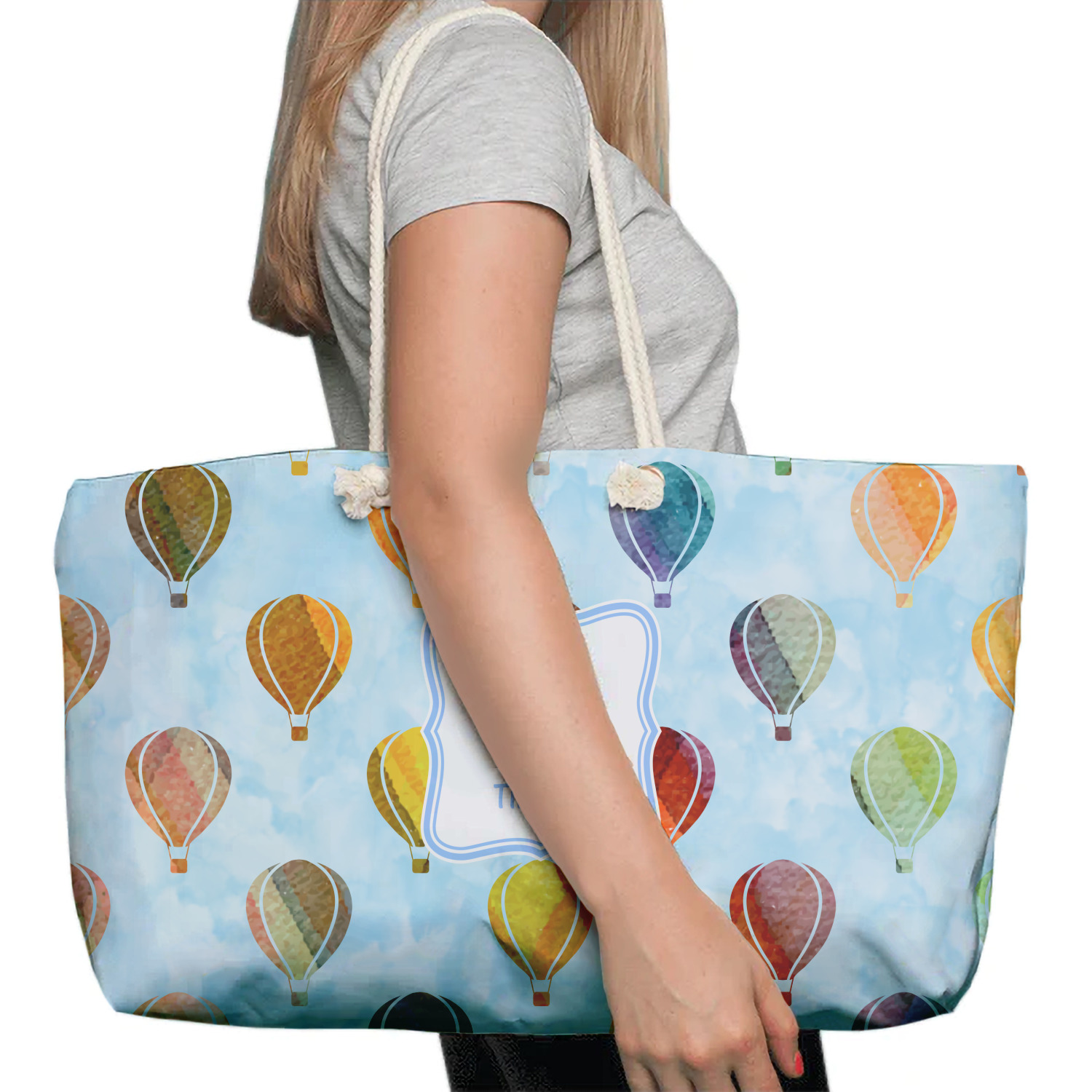 Our oversized weekender tote with rope handles is perfect for your weekend at the beach or on the town. This large tote are 24" W X 13" H, with a 5" gusset and a 27" thick rope handles with a knot that is put through a grommeted brass hole.