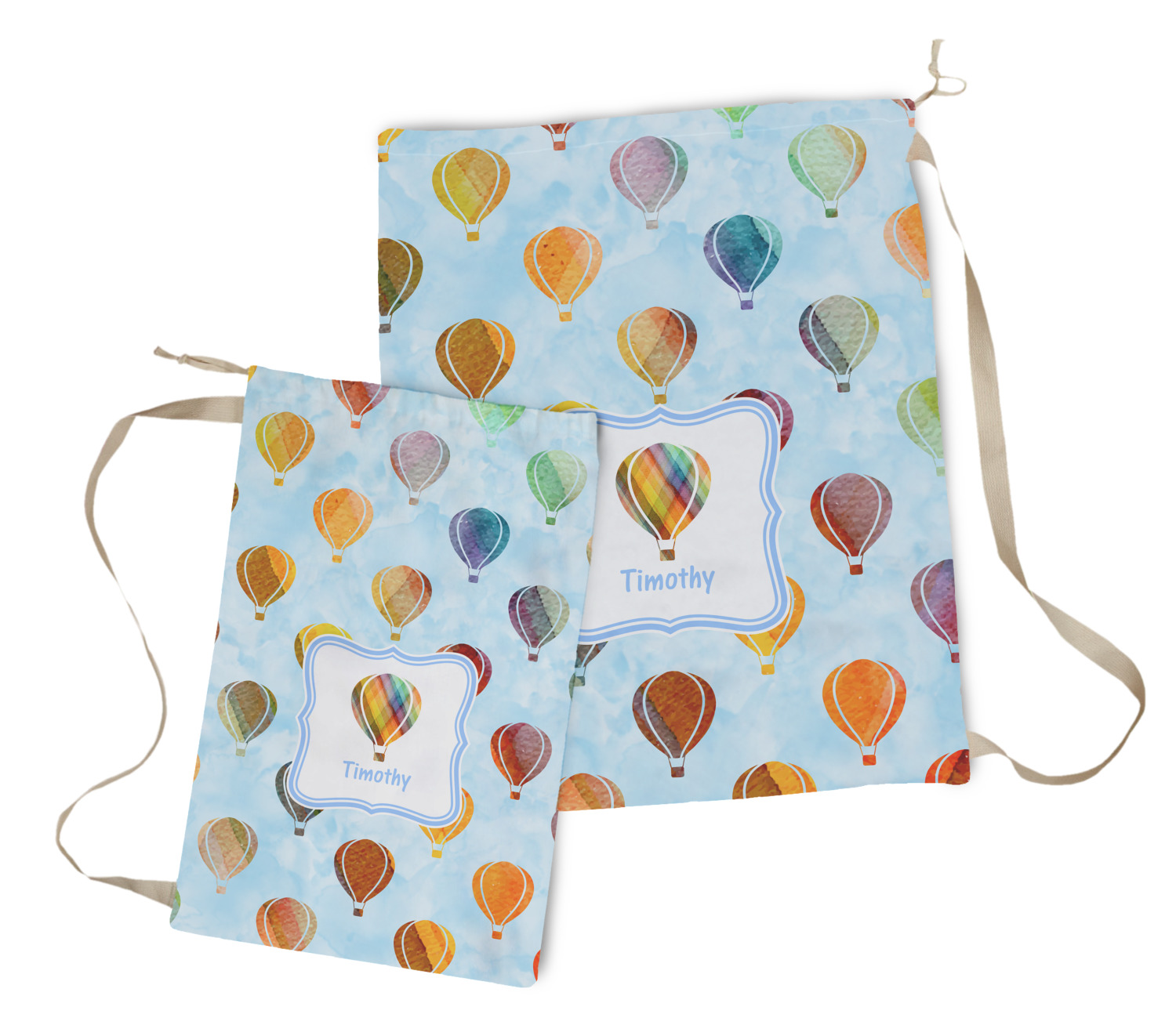 Carry your laundry in style with these customized laundry bags. Available in two sizes, featuring a natural colored woven strap and a cinch cord, these bags hold a lot of clothes or anything else you want to fit in them.