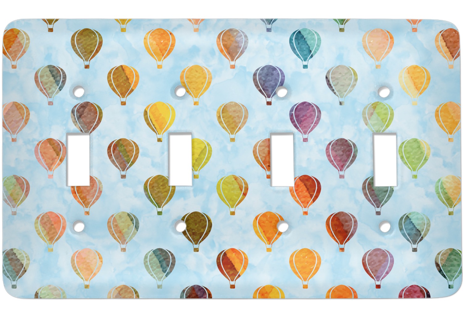 This watercolor hot air balloons design is simply adorable. The design background is the blue sky done in watercolor. The hot air balloons are also done in watercolors; in shades of oranges, reds, greens & teals.