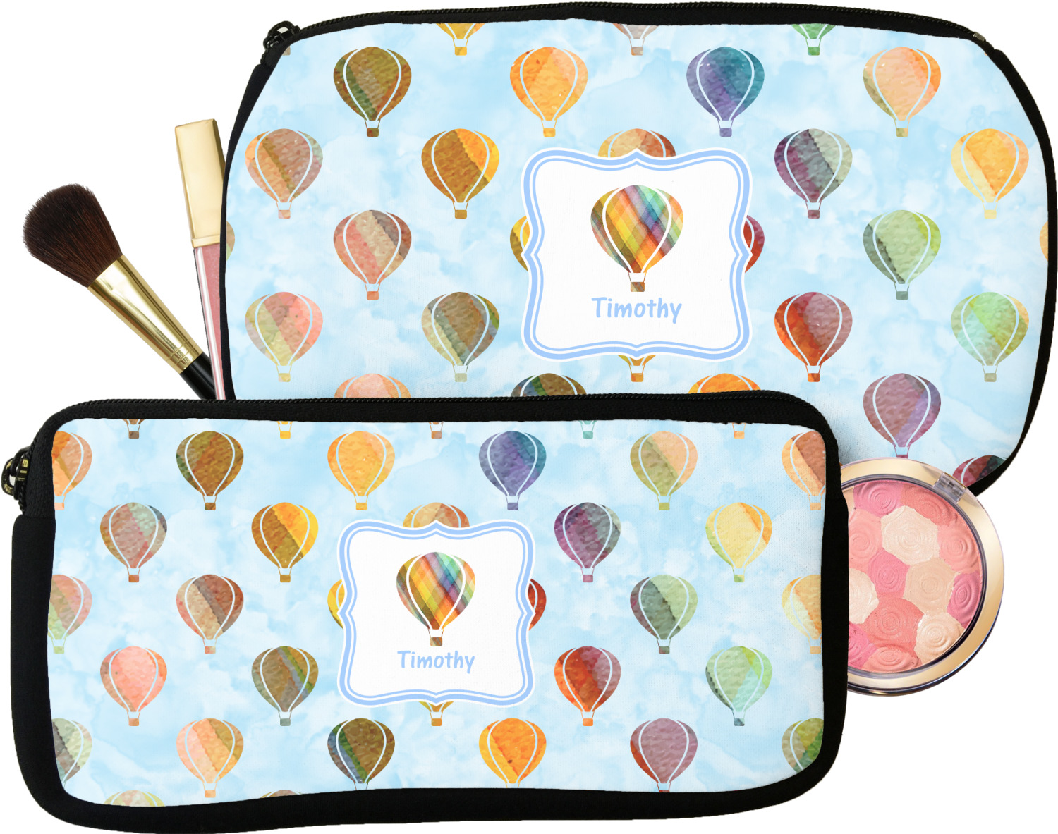 Our personalized makeup bags are available in many different designs, patterns and colors - so you are sure to find one that will love. They are made of neoprene (same material as wet-suits) and thus are water resistant, so spillages in your makeup bag will not end up all over you purse. They are customized on one side and are black on the other side and the zipper is black as well.