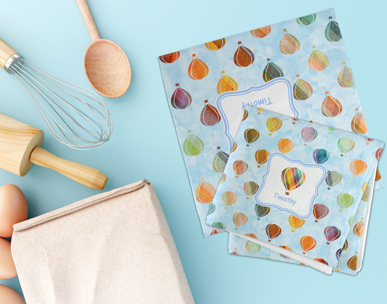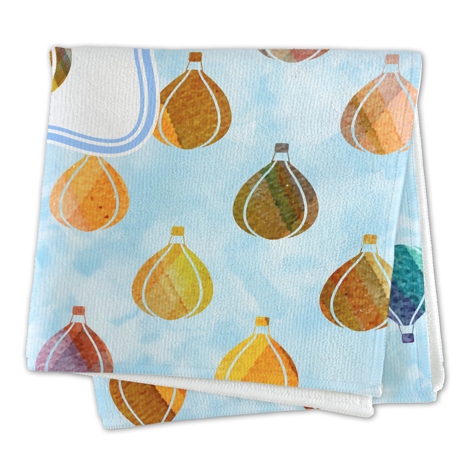 This watercolor hot air balloons design is simply adorable. The design background is the blue sky done in watercolor. The hot air balloons are also done in watercolors; in shades of oranges, reds, greens & teals.