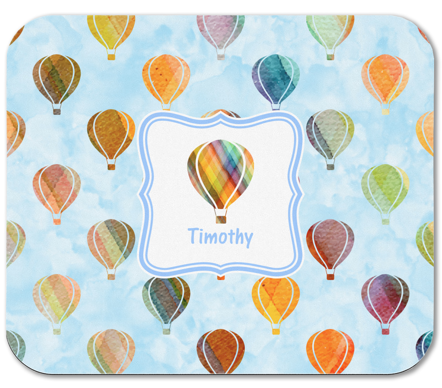 We chose to personalize it with a decorative square label and our graphics & text style. We chose to use a hot air balloon as our graphic from our transportation collection and used a name for personalization. We chose baby blue for our color to coordinate with the sky.