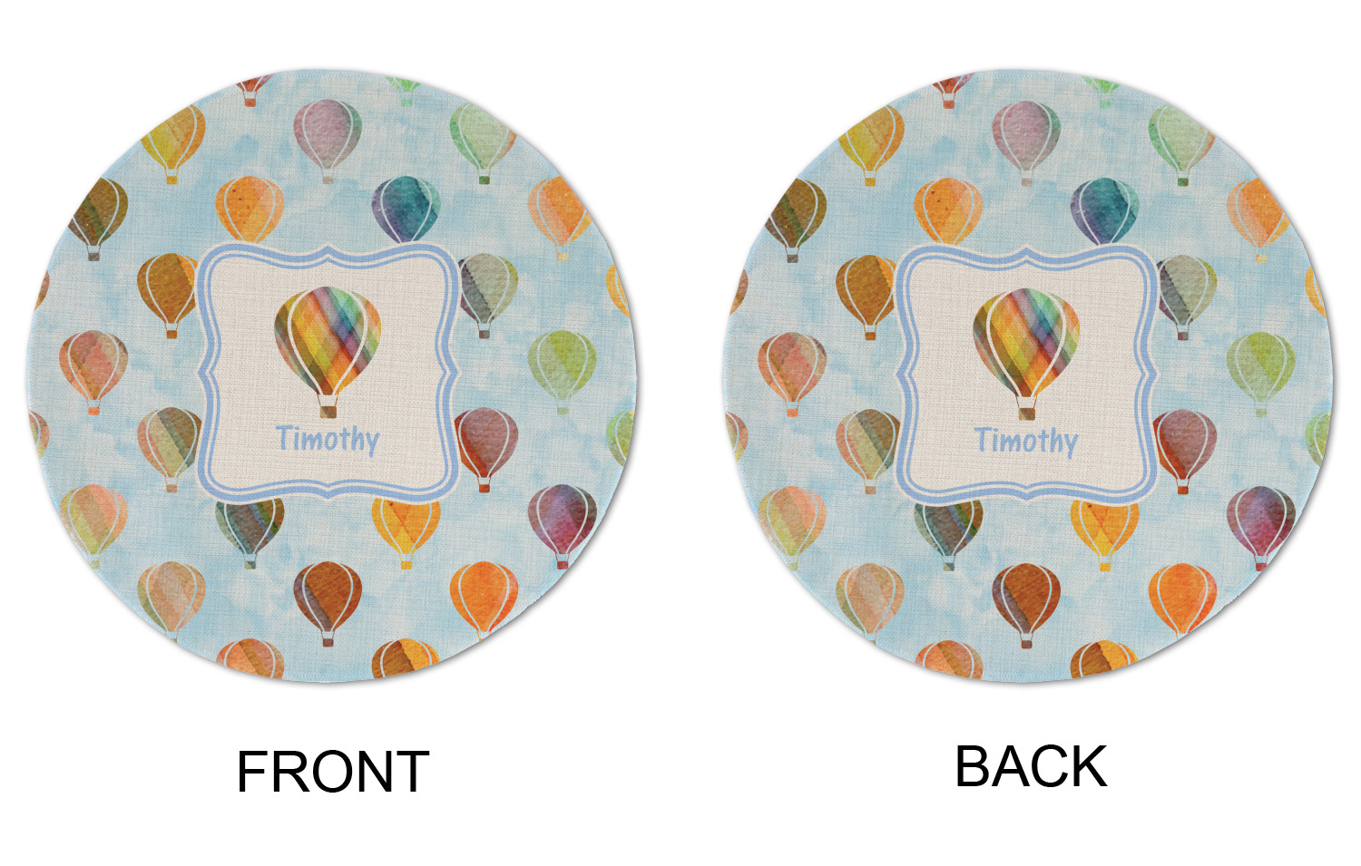 We chose to personalize it with a decorative square label and our graphics & text style. We chose to use a hot air balloon as our graphic from our transportation collection and used a name for personalization. We chose baby blue for our color to coordinate with the sky.