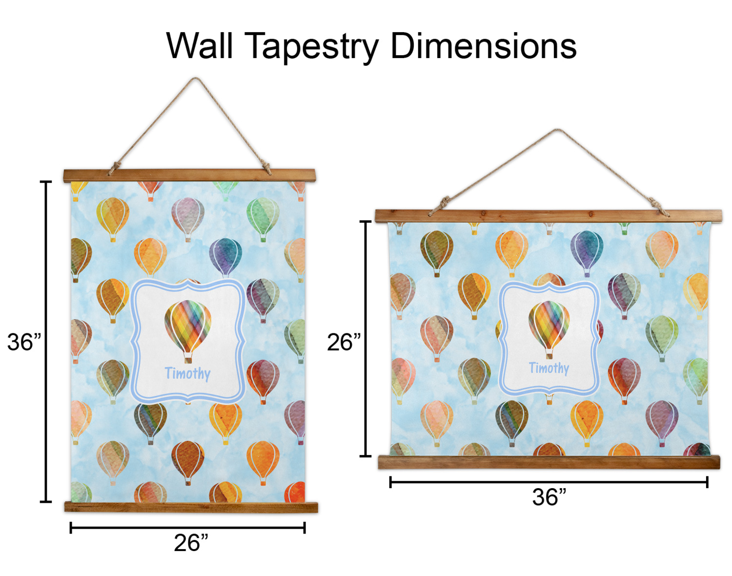Made in two different orientations - portrait or landscape - both are 26" x 36". Your design is printed on a high quality polyester fabric with hemmed edges. The wood on the top and bottom of the tapestry is 1.25" tall and 0.25" thick and there are two pieces on top and bottom which sandwich the fabric.