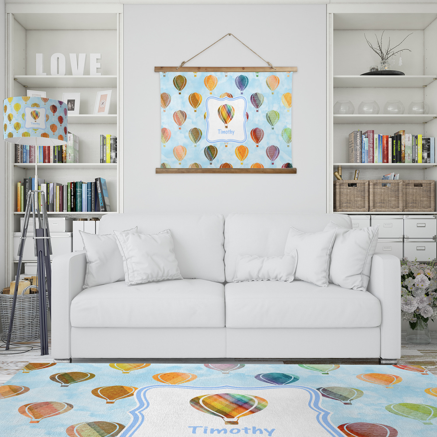 We chose to personalize it with a decorative square label and our graphics & text style. We chose to use a hot air balloon as our graphic from our transportation collection and used a name for personalization. We chose baby blue for our color to coordinate with the sky.