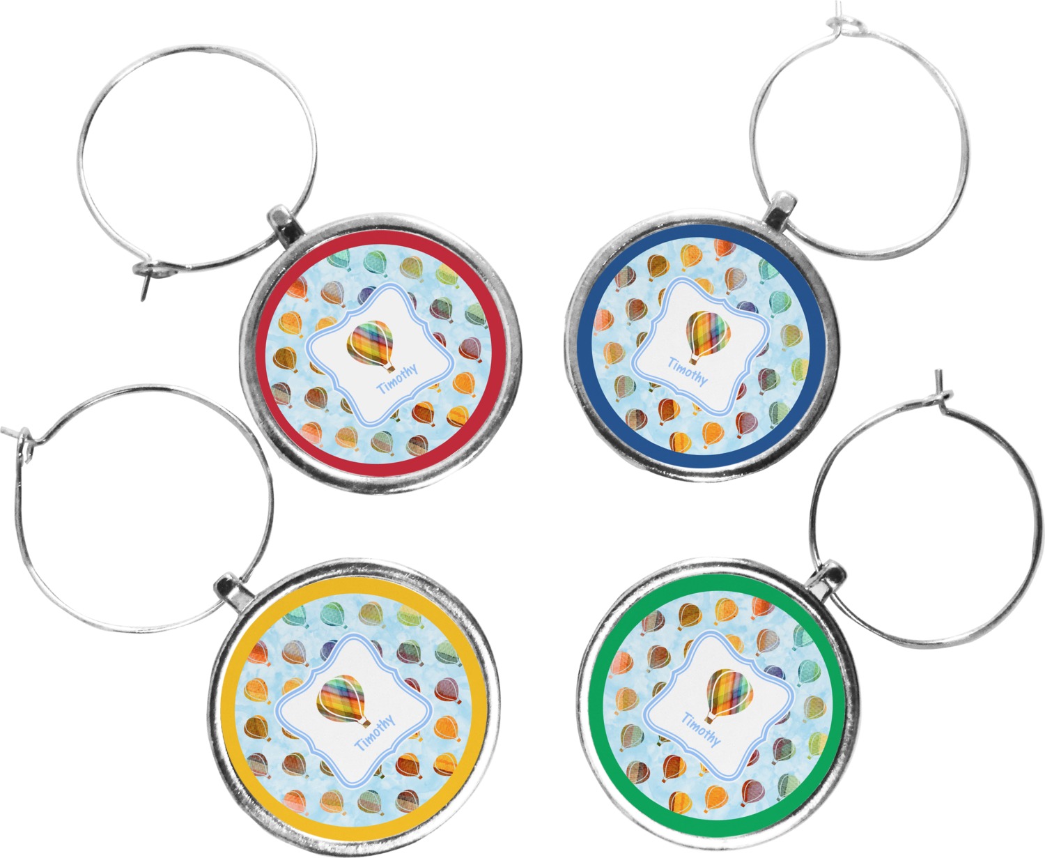 Your wine glass markers are comprised of a circular zinc plate with a 1.25 inch diameter. The zinc plate hangs from a zinc loop, which can be easily secured and removed from the stem of a wine glass. Your customized design is printed onto a 1 inch diameter insert, and then placed into the wine glass charm itself. Though sold in a set of four, you can personalize each charm individually and change the colors of the ring around your design, depending on your needs.